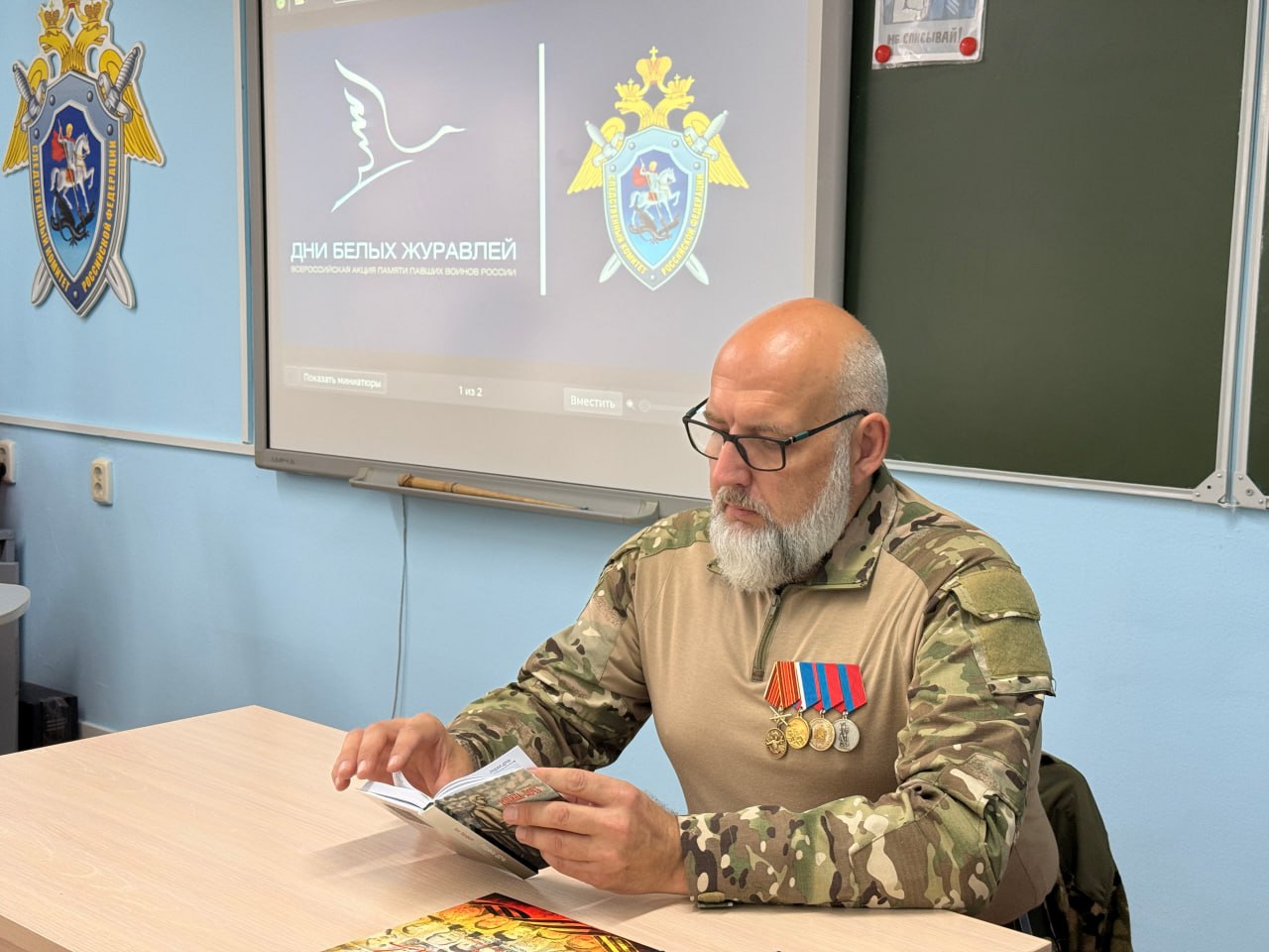 Почётным гостем мероприятия стал заместитель председателя «Кузбасского союза ветеранов СВО» Виталий Валерьевич Дорофеев. Участник специальной военной операции поделился с кадетами воспоминаниями о боевых буднях, рассказал о значении стойкости, товарищества и веры в победу. В завершение встречи Виталий Валерьевич прочитал кадетам стихотворения собственного сочинения и подарил им свой поэтический сборник «Родина-мать» с автографом на память.