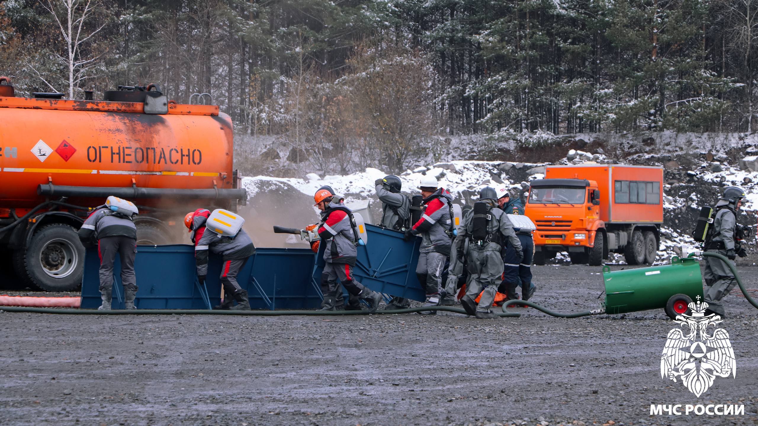 Согласно легенде учений, в результате землетрясения произошла деформация горного обвала. При движении задним ходом для разгрузки БелАЗ сорвался с высоты 30 метров, повредив топливозаправщик, погрузчик и технологическую линию электропередач.