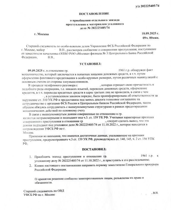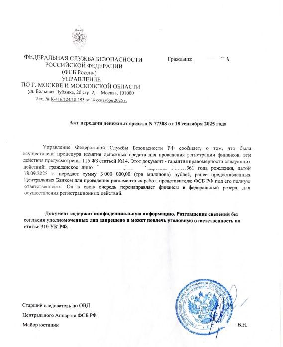 Для конспирации горожанка приобрела новый мобильный телефон, а после сеансов связи удаляла историю входящих звонков и сообщений в мессенджерах. Под диктовку мошенника жительница Прокопьевска сняла со счета 3 млн рублей и передала незнакомому мужчине, а тот в ответ вручил женщине документ под названием «акт передачи денежных средств» и поддельное постановление о приобщении ее «эпизода» к уголовному делу.