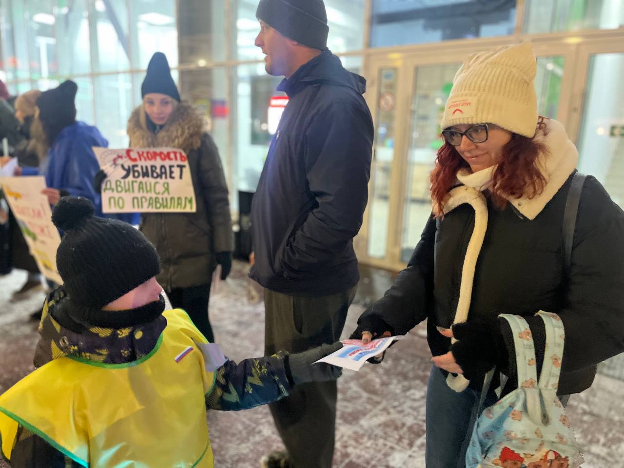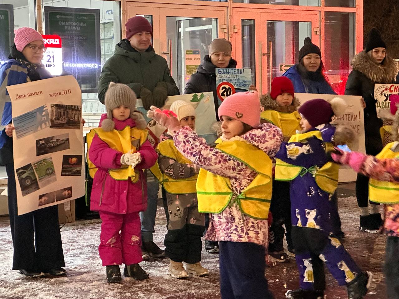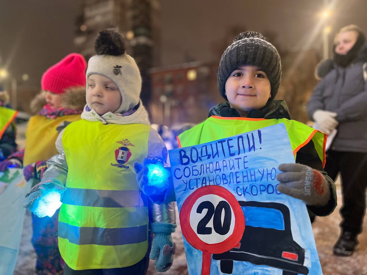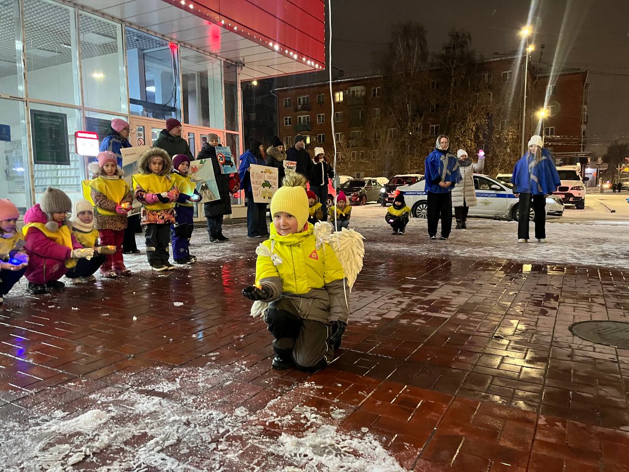 Воспитанники детских садов № 79 и 114 вместе с родителями и педагогами вышли к оживлённому перекрёстку, чтобы привлечь внимание водителей и пешеходов своим флешмобом.