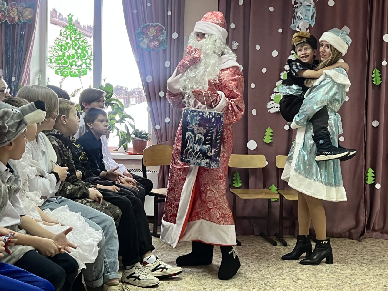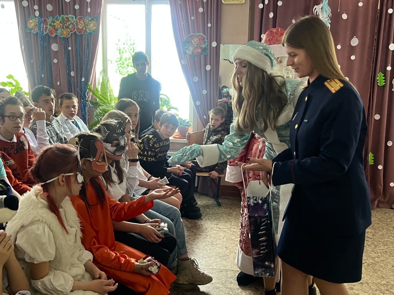 Практически в полном составе следователи приехали к детям в канун праздников. Чтобы создать по-настоящему сказочную атмосферу, они перевоплотились в любимых героев — Деда Мороза и Снегурочку, подготовив для ребят весёлую программу с играми, хороводами и танцами.
