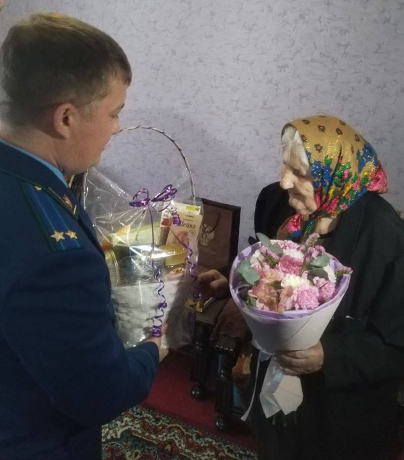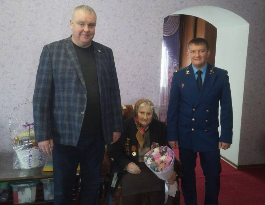 Прокурор города Мыски Алексей Давидюк совместно с главой города Евгением Тимофеевым выразили Лидии Ивановне слова благодарности, признательности и уважения, пожелали здоровья, благополучия, вручили цветы и подарки.