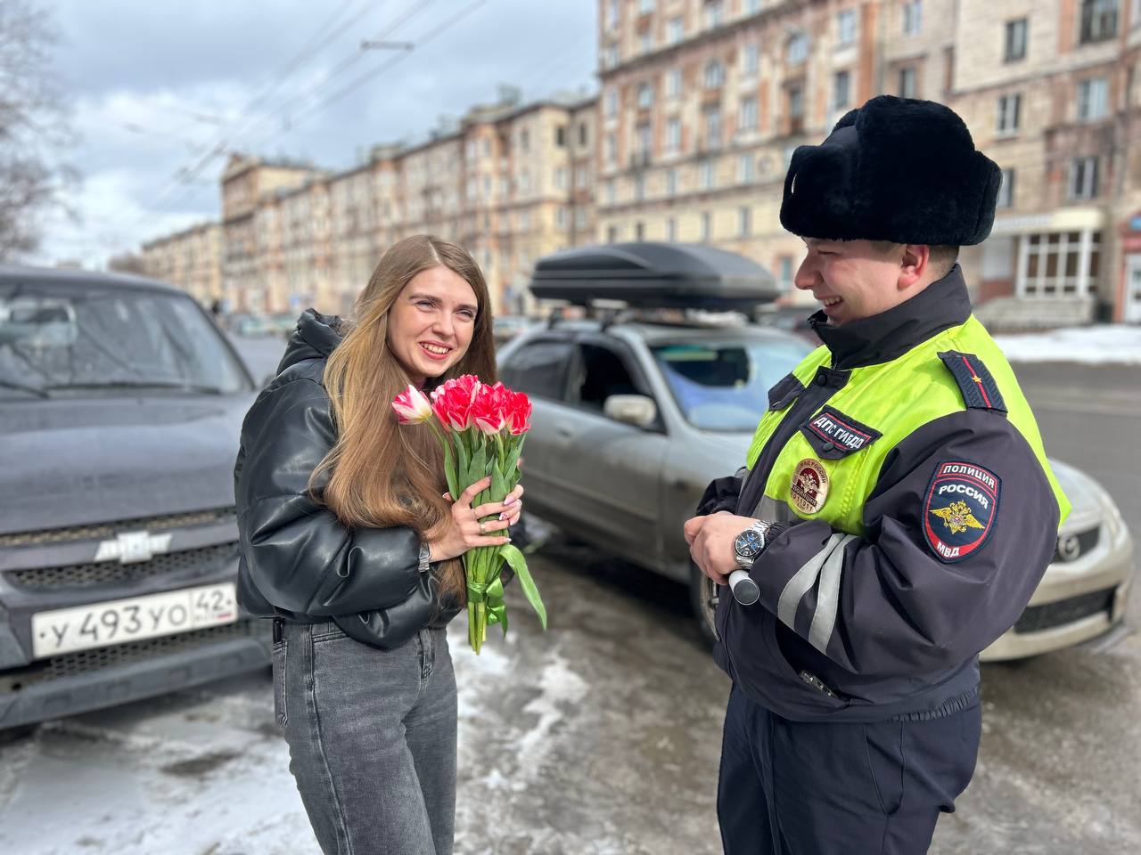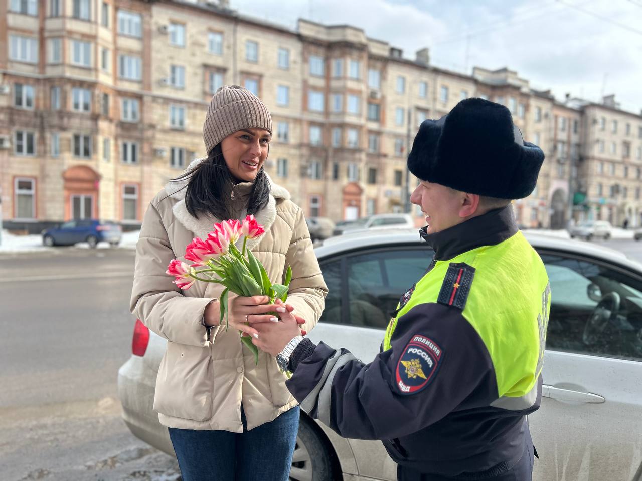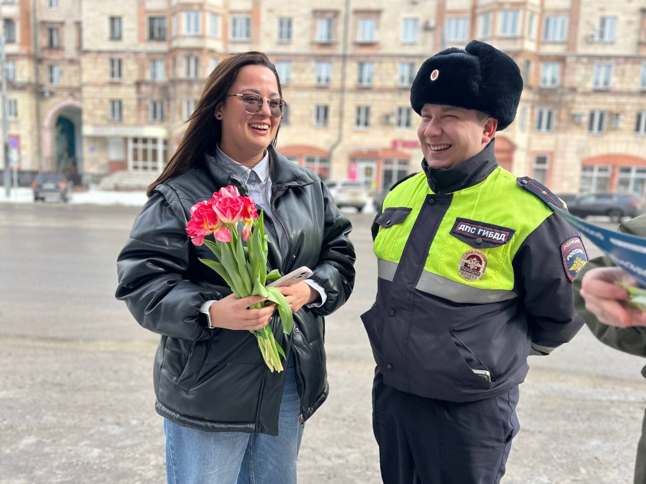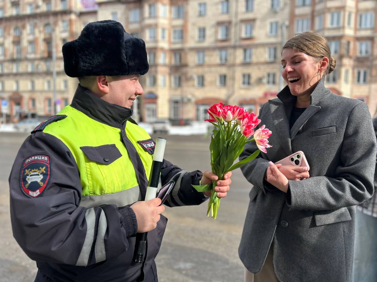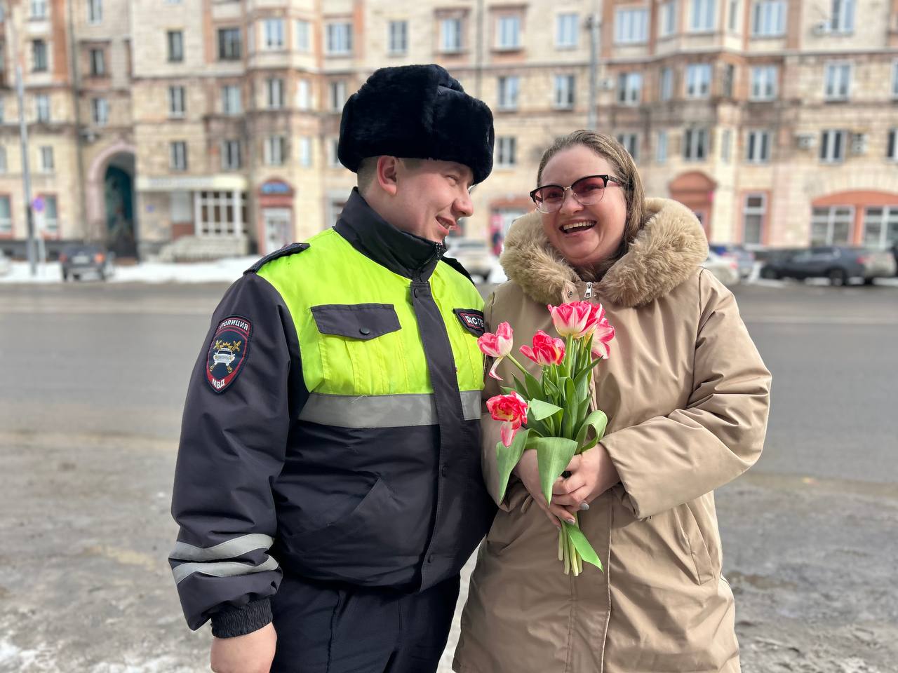Серая и дождливая погода — не повод грустить. Особенно, когда из рук сотрудника Госавтоинспекции получаешь не штраф, а букет солнечных тюльпанов.