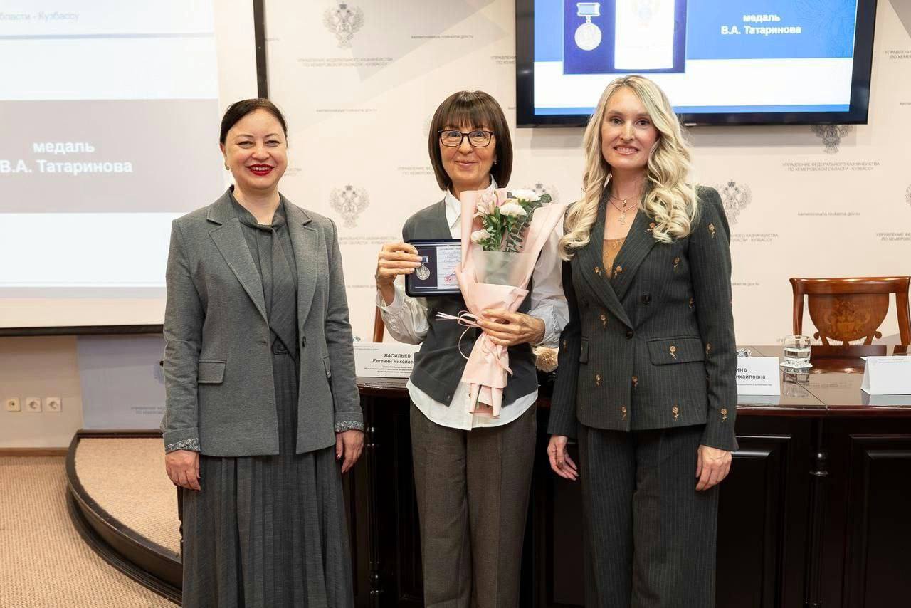 с коллективом Управления Федерального казначейства по Кемеровской области-Кузбассу, на которой в торжественной обстановке вручила ведомственные награды Федерального казначейства наиболее отличившимся сотрудникам;