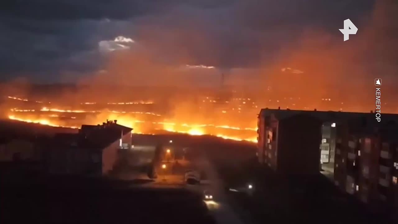 Сильный ветер разносит огонь возле жилых домов в Кемеровской области. Небо от масштабного пожара окрасилось в оранжевый.