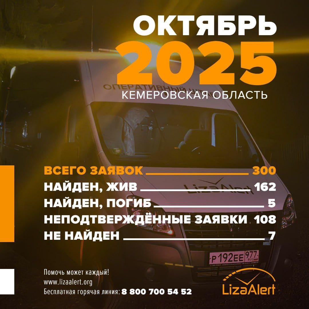 Отряд «ЛизаАлерт Кузбасс» поделились статистикой: в октябре поступило 300 заявок на поиск людей. Из них 18 на поиск маленьких детей. Поиски тех, кто не найден, продолжаются.Написать Telegram MAX