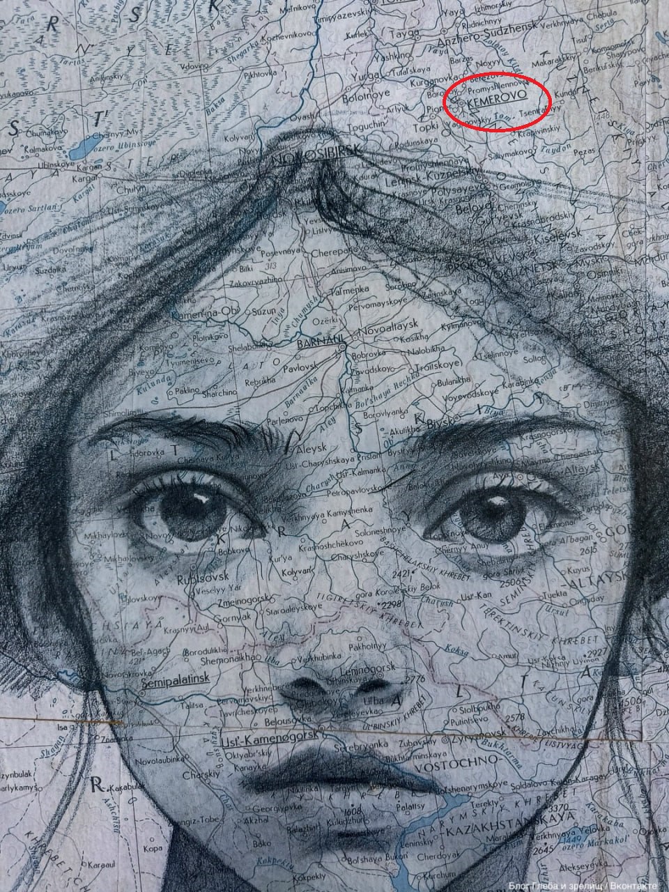 Мурал в виде лица девушки с наименованиями городов, в том числе и Кузбасса, принадлежит кисти художника Антонио Алвареса Гордилло.
