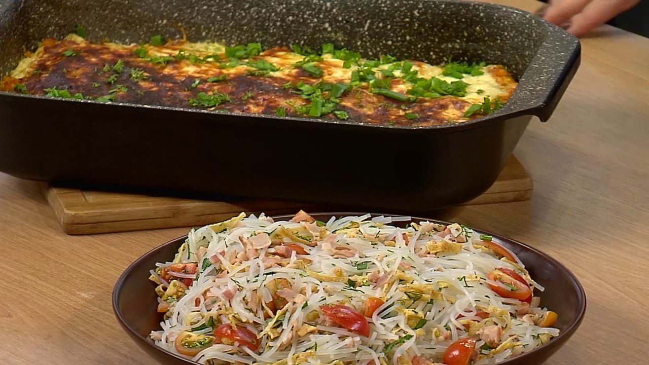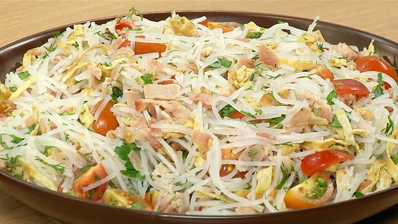 На кухне тоже проявим смелость. Нарядим рыбку аппетитной шапочкой и дополним тёплый салат с фунчозой необычными ингредиентами.
