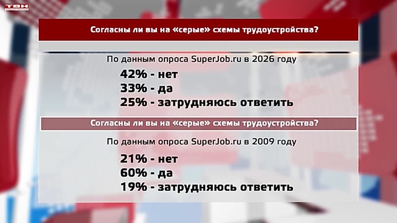 Каждый третий соискатель в России согласен на «серые» схемы трудоустройства. Данные опроса приводит портал SuperJob. Сегодня 33% россиян готовы получать зарплату в конверте, лишь бы работа была. При этом 42% опрошенных будут трудоустраиваться только «в белую»: с официальной зарплатой, больничными и отпусками. Ещё 25% затруднились дать точный ответ. Примечателен этот опрос в динамике – впервые его провели в начале 2009 года, когда был экономический кризис. И тогда на «серую» зарплату были согласны 60% респондентов и лишь каждый пятый настаивал на официальном трудоустройстве.