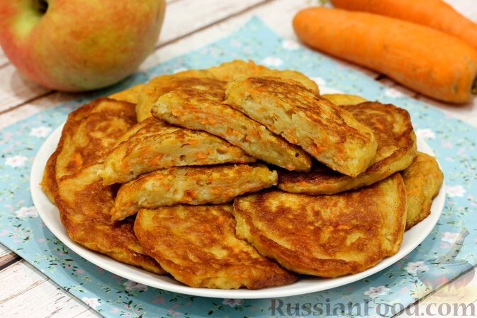 - Морковно-яблочные оладьи: Мягкие и ароматные, эти оладьи с добавлением яблока и моркови дополнены пряностями, создающими уникальный вкус.