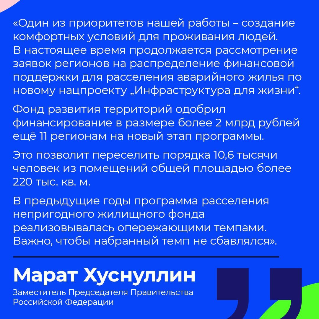 Программа переселения реализуется в рамках национального проекта «Инфраструктура для жизни». До 2030 года планируется переселить более 345 тысяч граждан России из непригодного для проживания жилья.