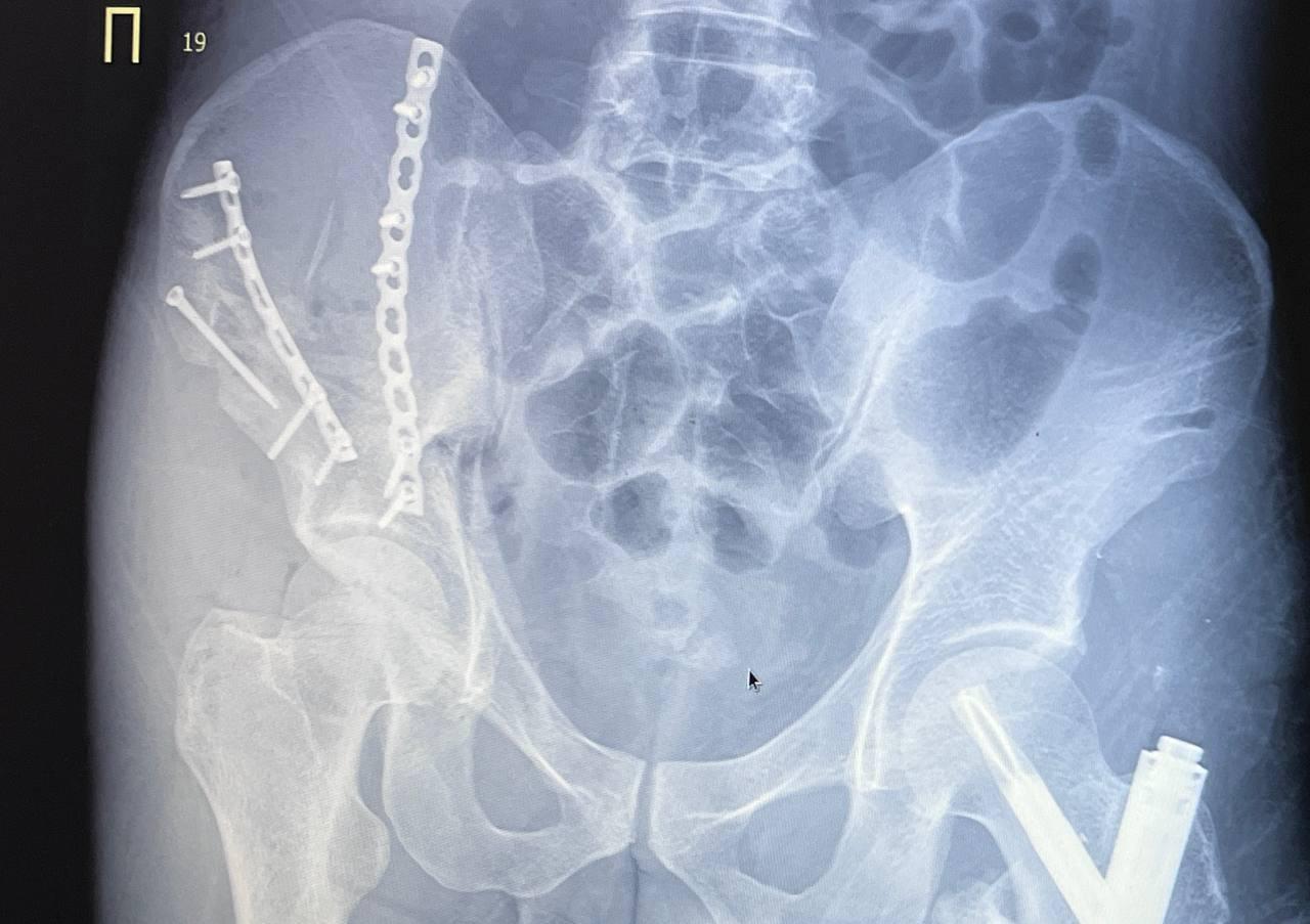 Тазовые кости мужчины практически полностью раздробились. Левое бедро закрепили штифтом, правую часть таза собрали по кусочкам за три операции. Сейчас мужчина идёт на поправку.