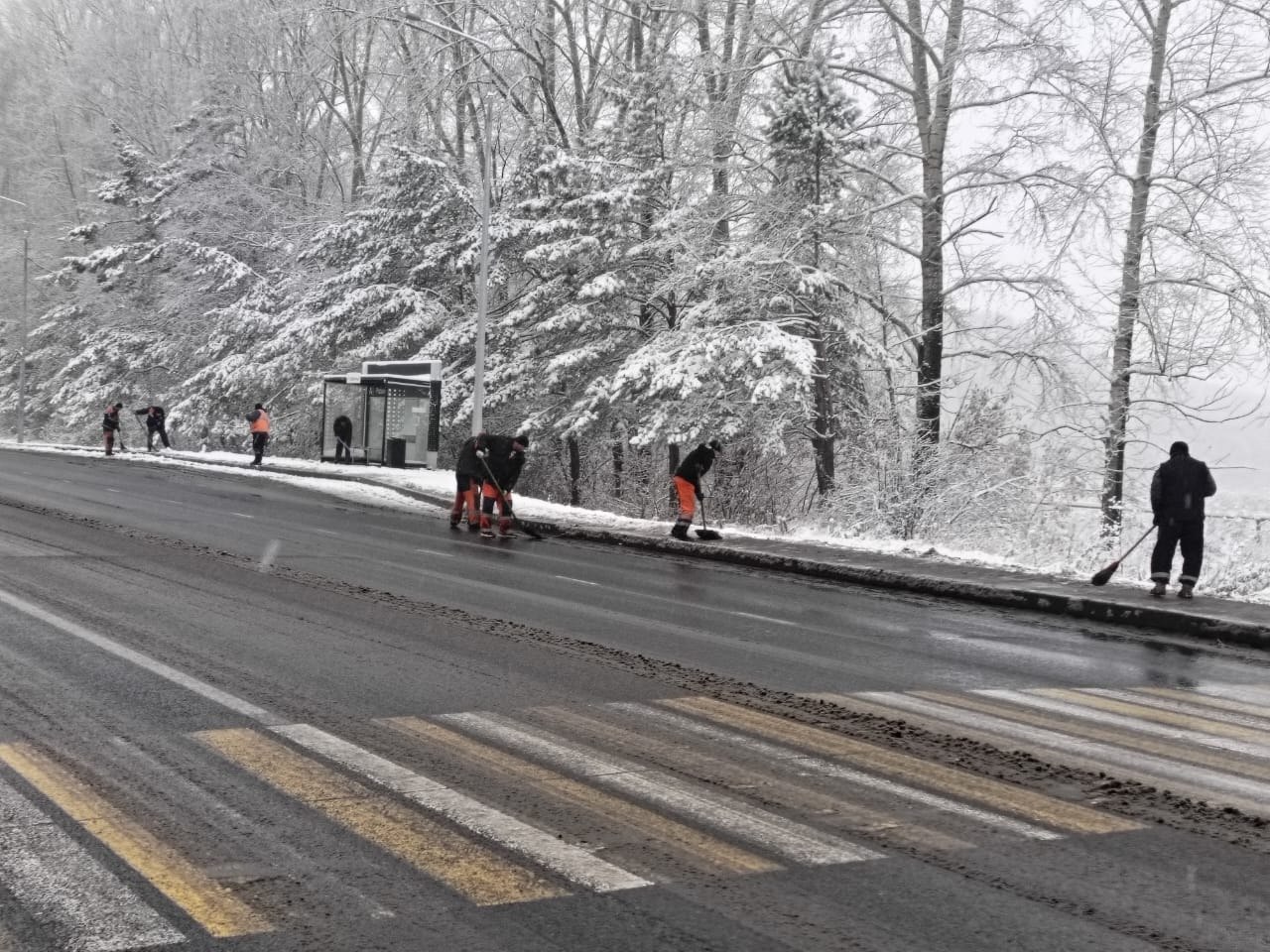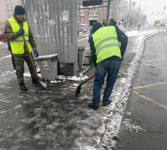 Убирают снежную шугу на остановочных площадках по улицам Гагарина, Тухачевского, шоссе Леонова, Свободы,проспектам Притомский, Молодежный, Октябрьский, Ленина.