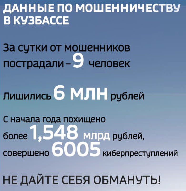 За минувшие сутки мошенники обманули 9 кузбассовцев. Среди них бухгалтер из Прокопьевска. Женщине позвонила лже-юрист и сообщила: произошла утечка данных сотрудников. Следом трубку взял якобы представитель правоохранительных органов: рассказал о переводе денег заграницу. В итоге женщина отдала незнакомцам 5 миллионов рублей.