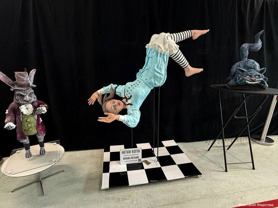 Кондитер Анастасия Федотова установила фигуру падающей в кроличью нору "Алисы в стране чудес" в холле кемеровского филиала РГИСИ. Композиция выполнена из 65 кг шоколада.