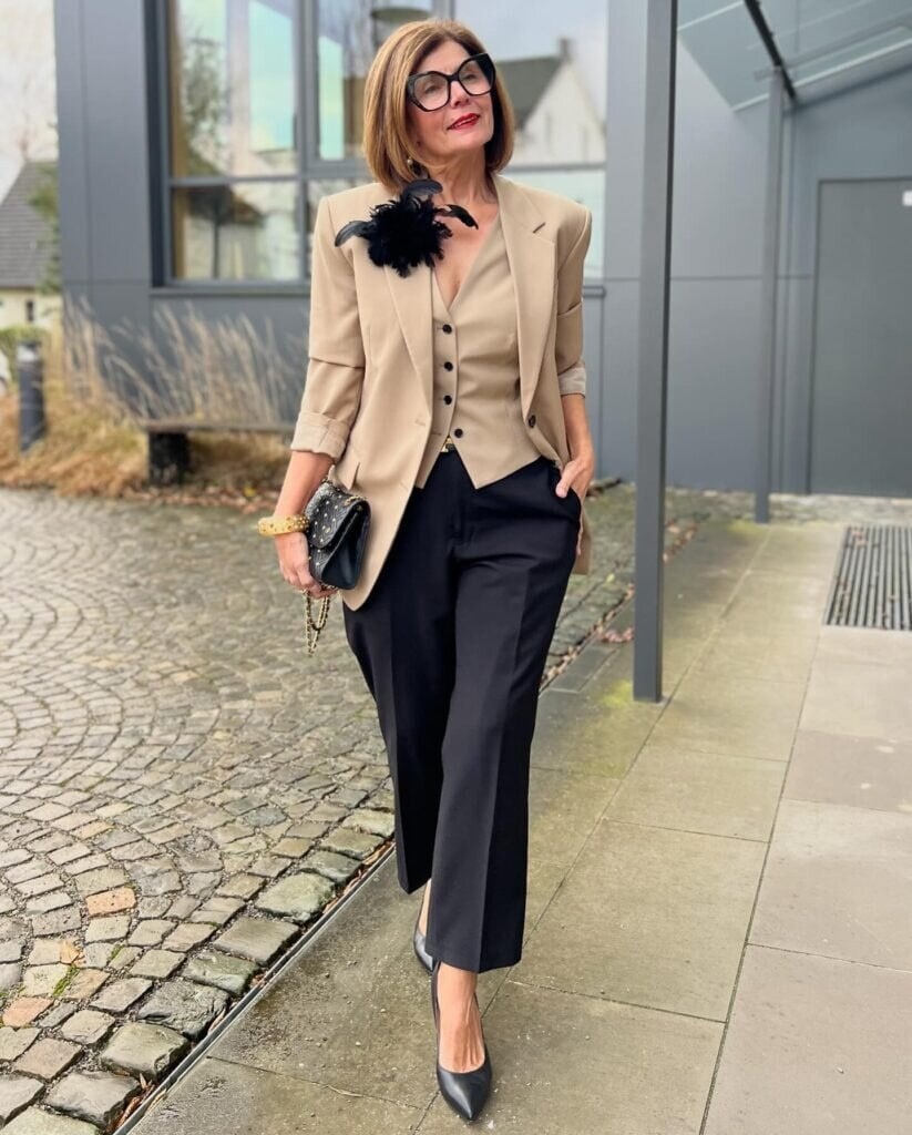 - Широкие черные брюки, дополненные классическими лодочками, идеально сочетаются с бежевым жилетом и жакетом. Это сочетание создаст стройнящий силуэт, а декоративный цветок на лацкане добавит изюминку.