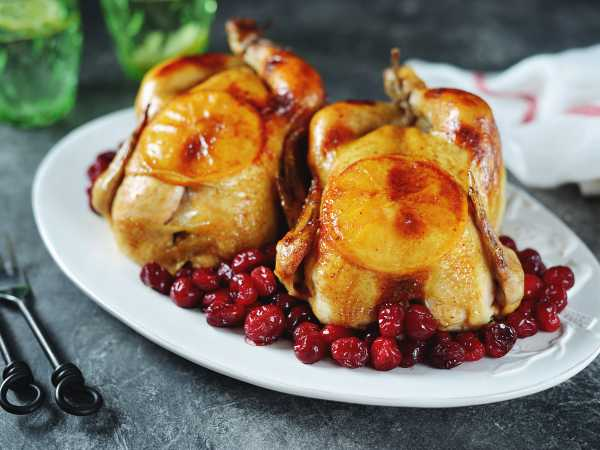 Поместить тушки грудкой вверх на противень и запекать в течение 45–50 минут. За 10 минут до конца готовки повысить температуру до 220°C или включить режим гриля для появления аппетитной золотистой корочки.