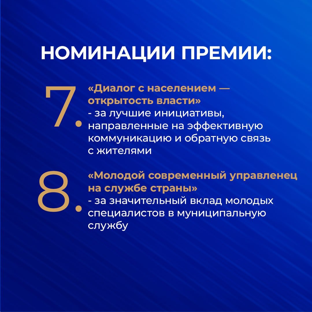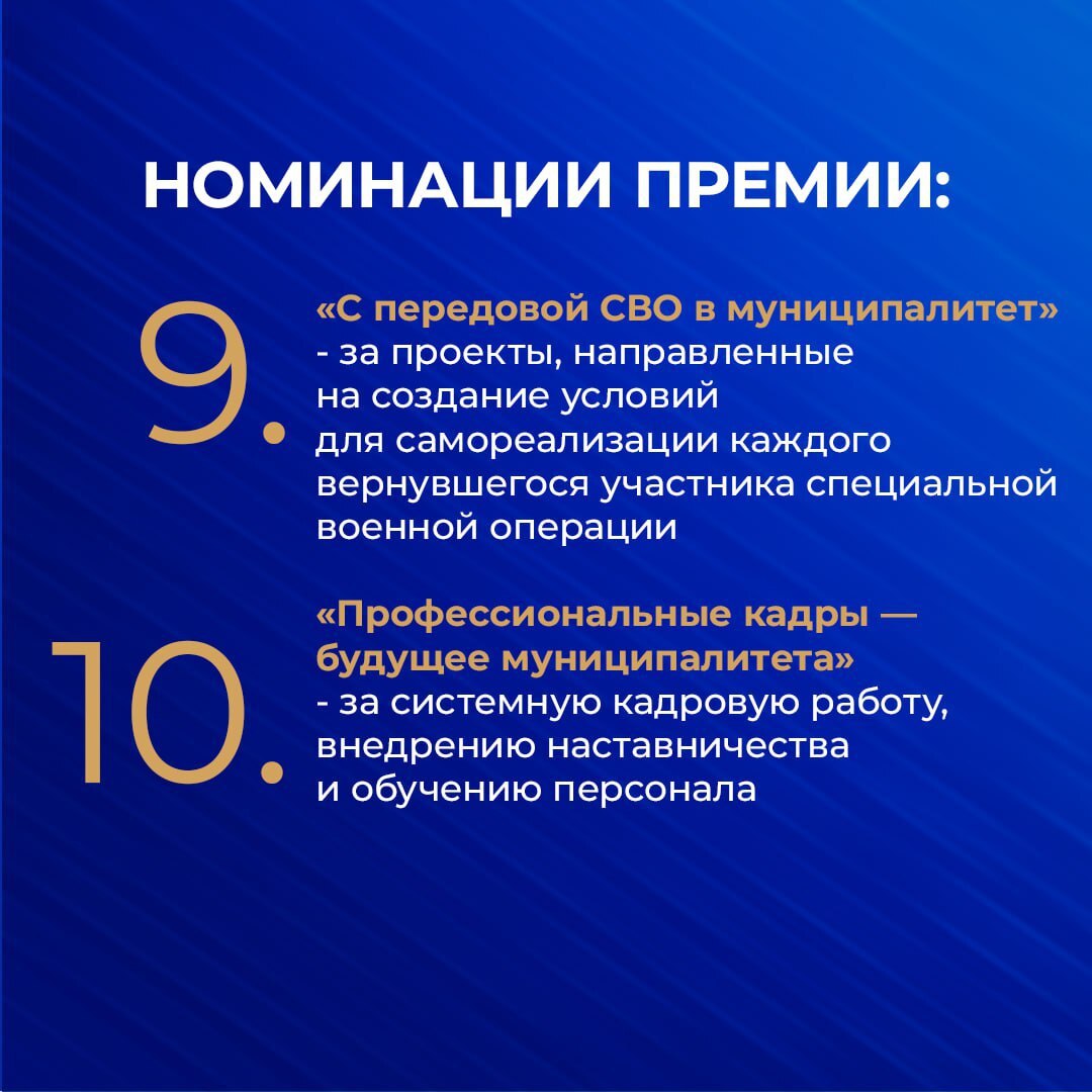 В этом году утверждены 10 номинаций, включая новые: «С передовой СВО в муниципалитет» и «Профессиональные кадры — будущее муниципалитета». Премия учреждена по поручению Президента РФ и отмечает тех, кто своим трудом улучшает жизнь на местах.