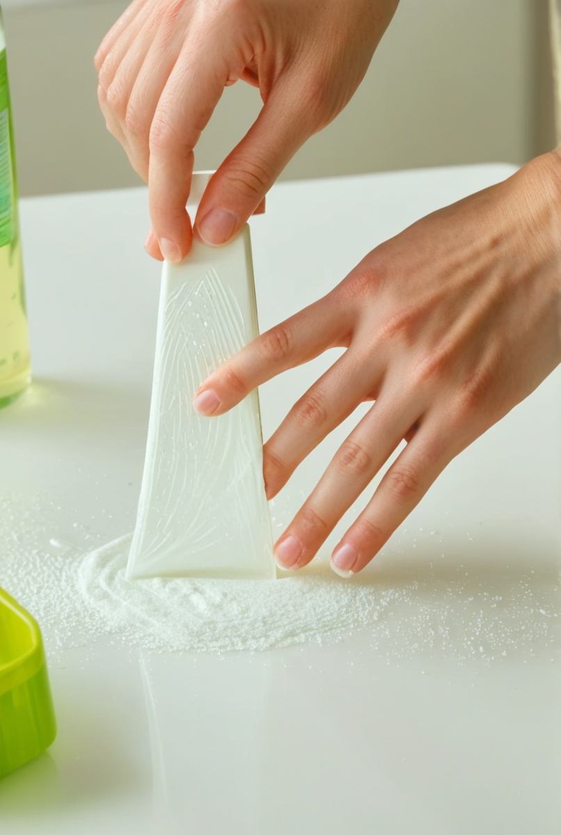 - Пищевая сода: Смешайте соду с водой до состояния пасты и аккуратно вотрите в клей. Сода мягко абразивна, что помогает удалить следы, не повреждая поверхность.