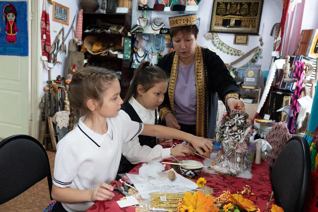 В комнате татарского быта «Ак калфак» дети под руководством наставника создают рукотворный шедевр. Когда будет готова, новогодняя ель отправится на городской конкурс «Новогодний этностиль». Чтобы искусственное дерево было красивым, рассмотрели популярные тренды в новогоднем декоре. Чтобы выделить свою национальность, подобрали тесьму с орнаментом, узоры с тюльпаном - этот цветок в татарской культуре занимает почётное место. А чтобы подчеркнуть дружелюбие, в середине поместили фигурки представителей народов, проживающих в Кузбассе. Ёлку назвали «Хоровод дружбы».