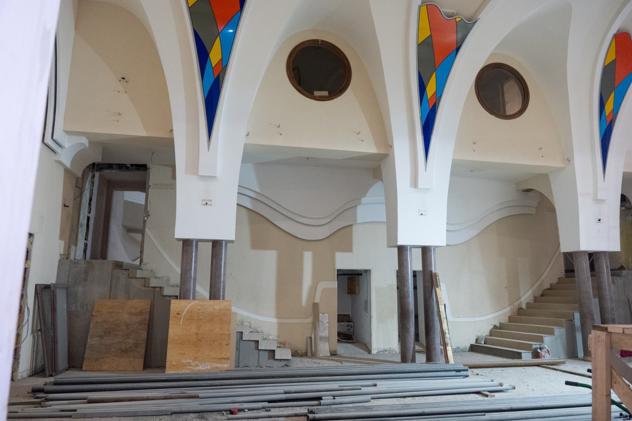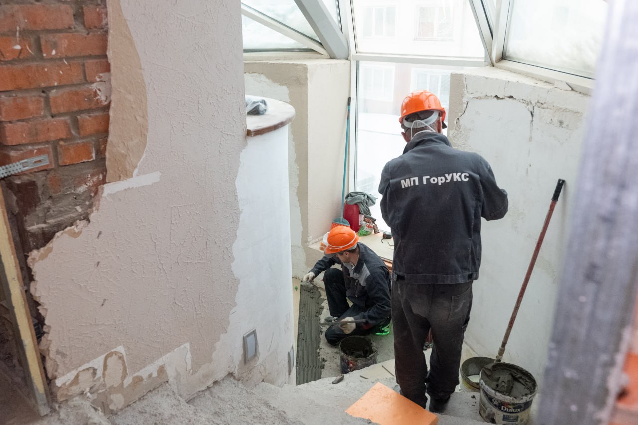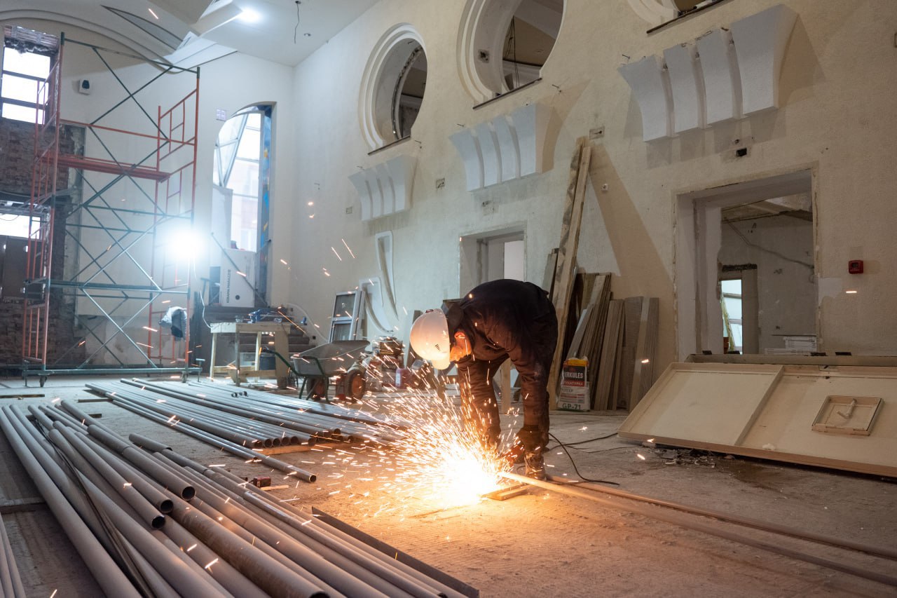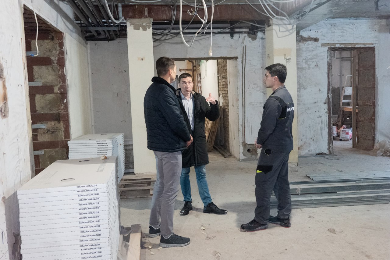 Демонтажные работы позади. Сейчас в служебно-административных кабинетах идёт внутренняя отделка, в каминном зале на втором этаже специалисты укладывают плитку.