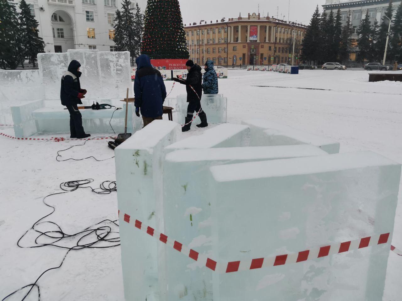 Начали строительство городка. Лед традиционно заготовили на Красном озере. 200 кубометров понадобится для нескольких горок, фигур, игровых композиций.