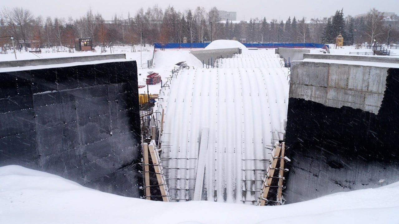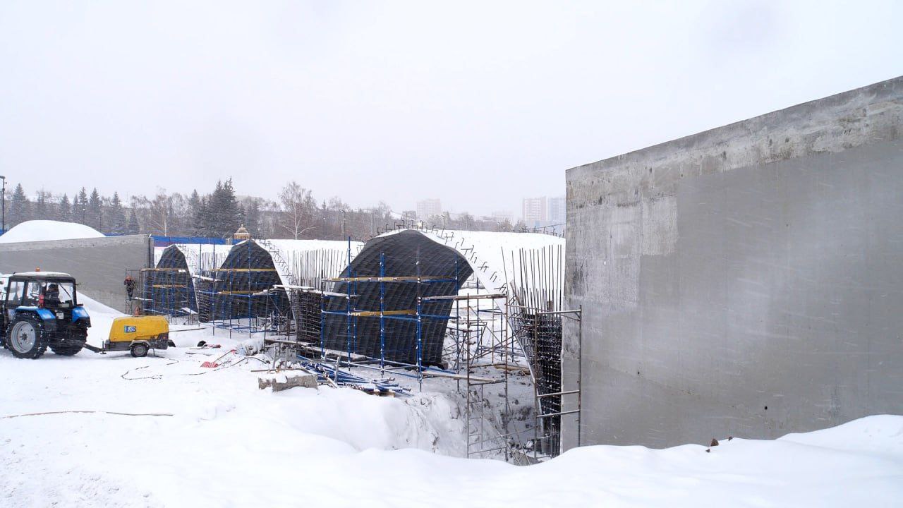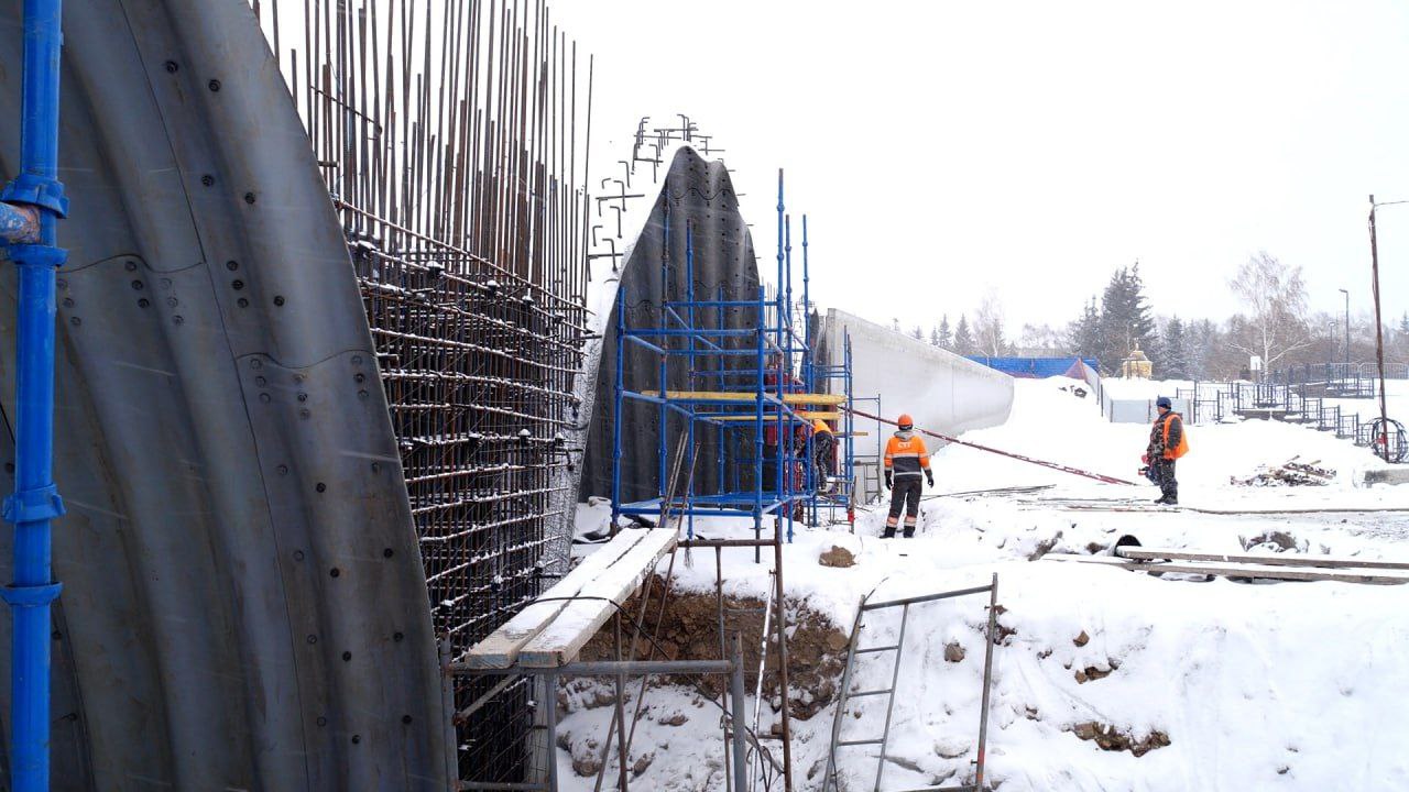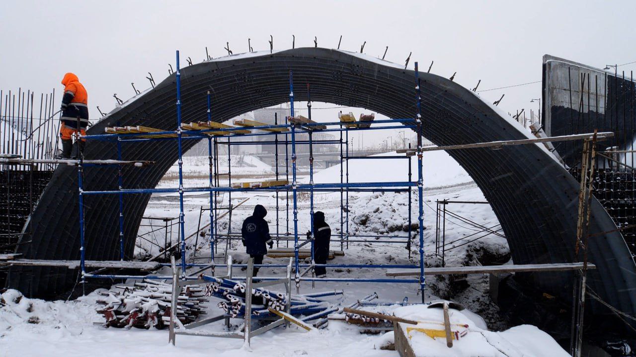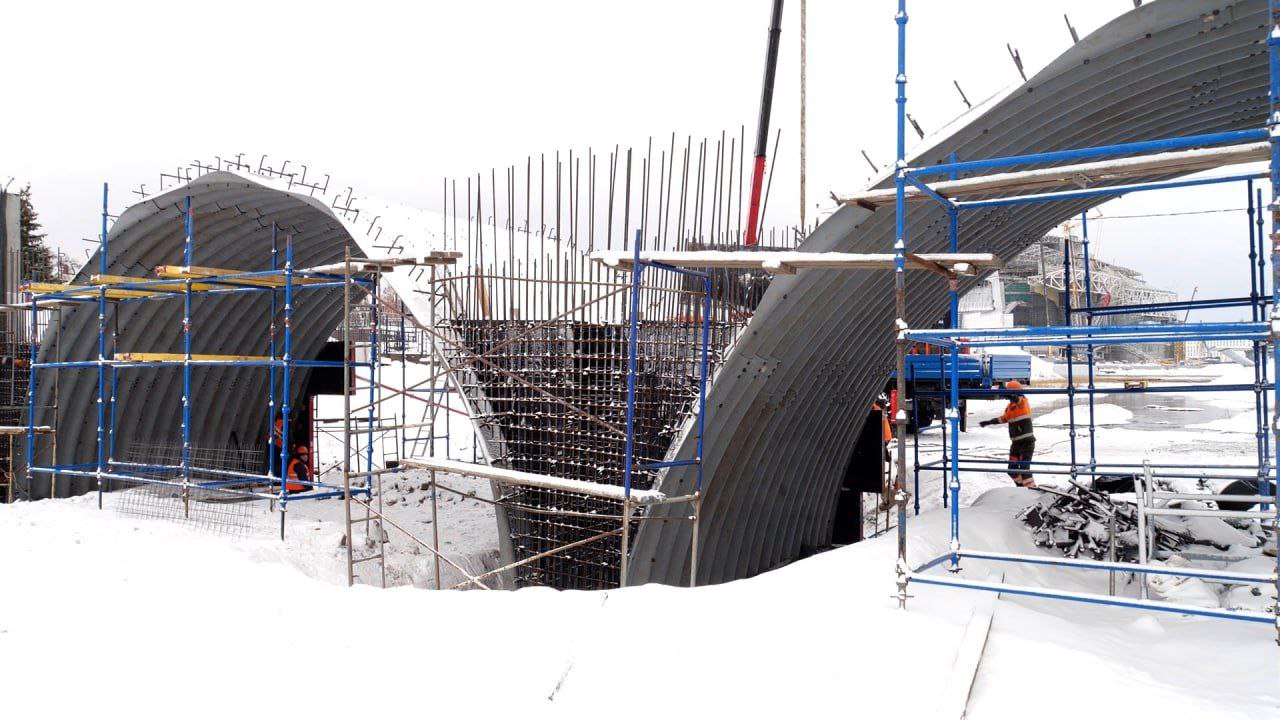 Все подготовительные работы, связанные с обустройством фундамента, буронабивных свай и подпорных стенок, завершены. Собраны и протянуты арочные конструкции. Подрядчик приступил к наземной сборке основных конструктивных элементов объекта.