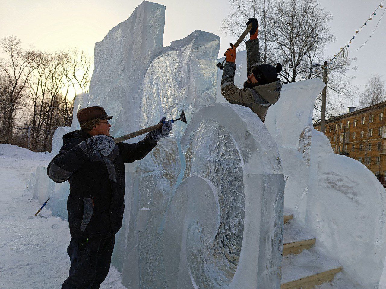 Традиционно городки строят на улицах Ушакова, 2 и Халтурина 35а - 37а. Мастера уже завершают работы на площадке у спортивного комплекса «Кировец». Наносят последние штрихи, совершенствуя тонкие ледовые узоры.