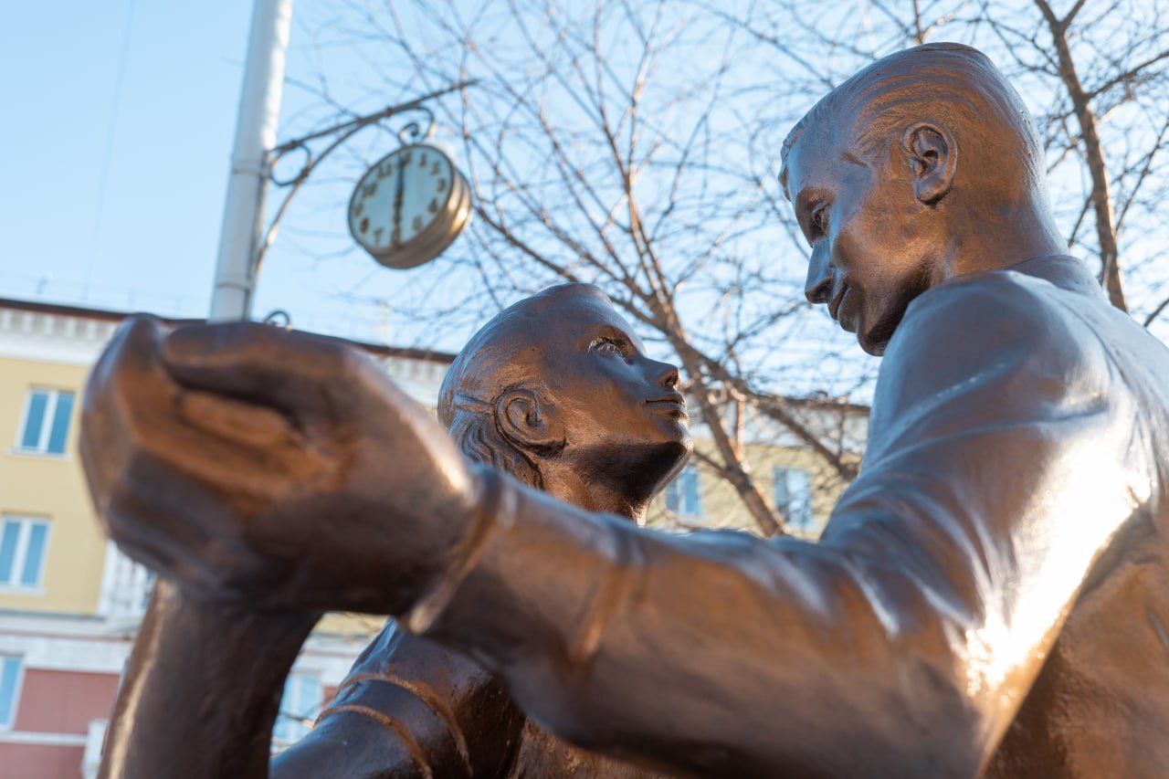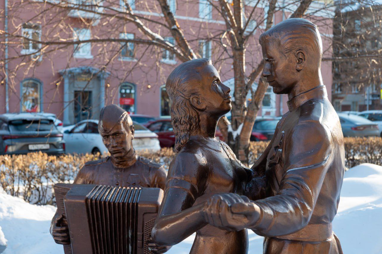 Словно замерла в ритме зимнего вальса знаменитая скульптура «В 6 часов вечера после войны» на улице Весенняя в Кемерове