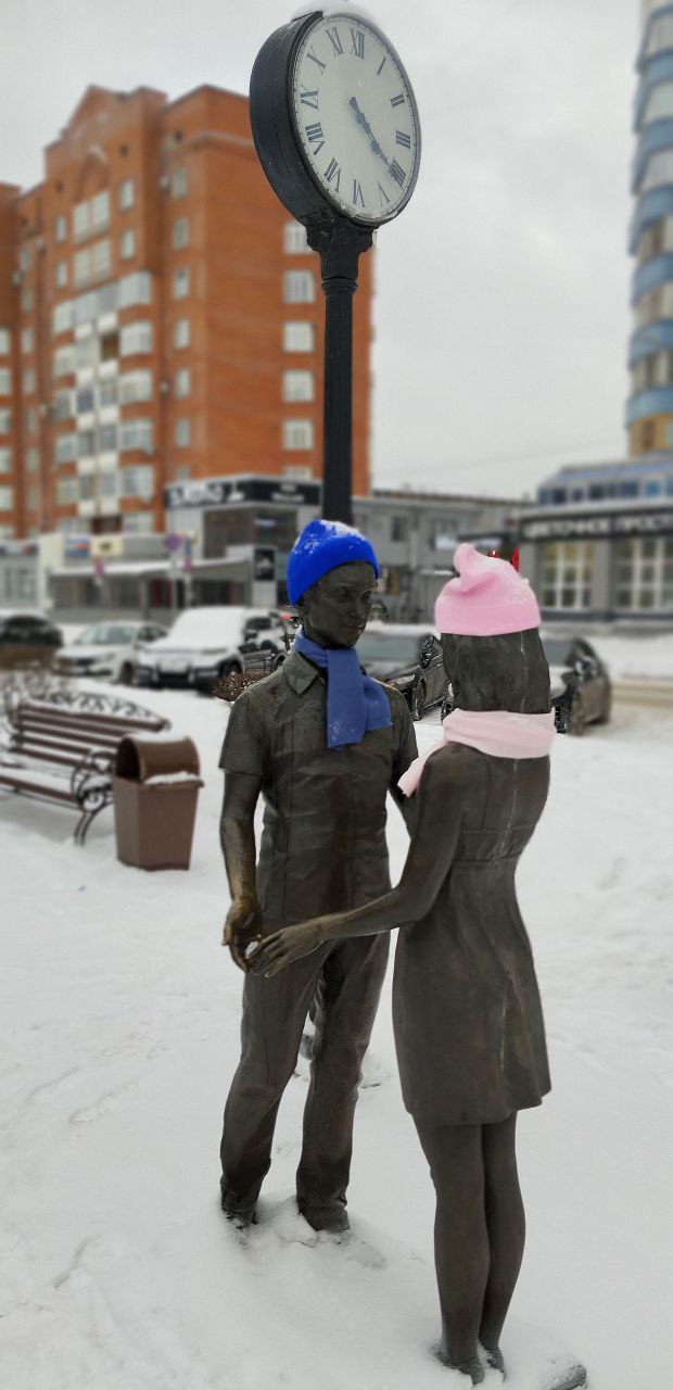 В Новокузнецке неизвестные позаботились о фигурах влюблённых в сквере имени Ермакова. У бронзовых юноши и девушки, которым в этом году уже по 12 лет, появились шарфы и шапки.