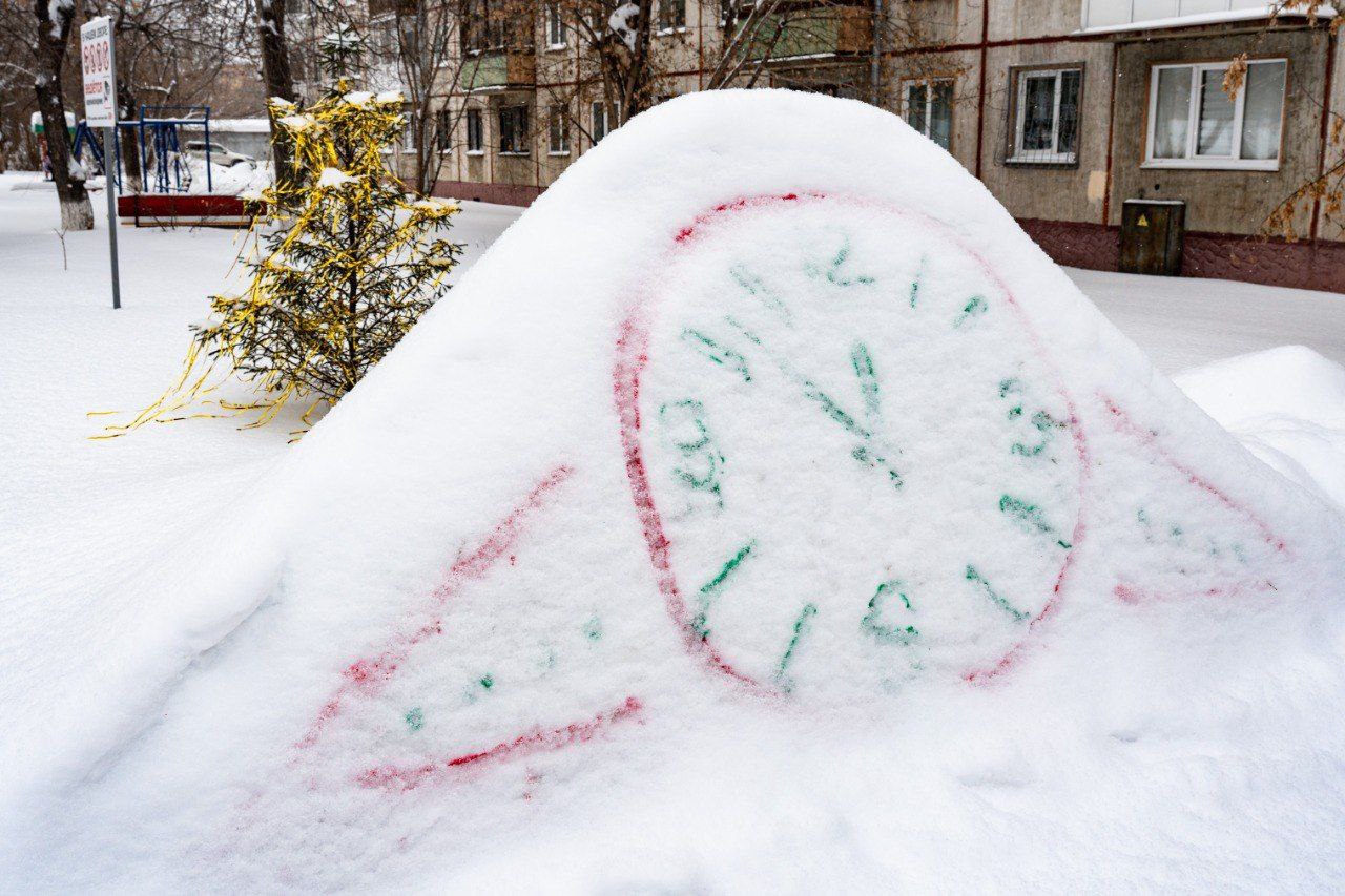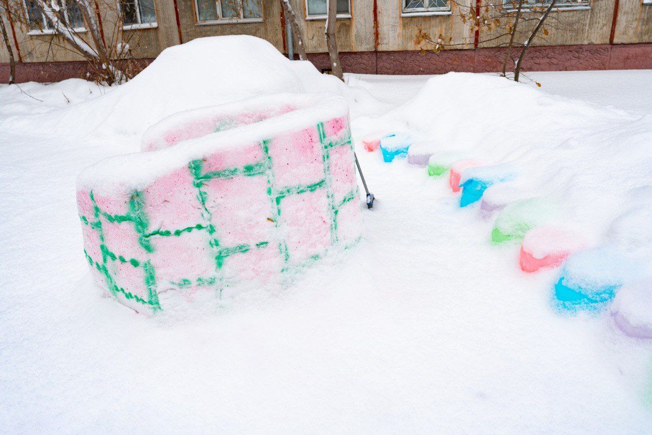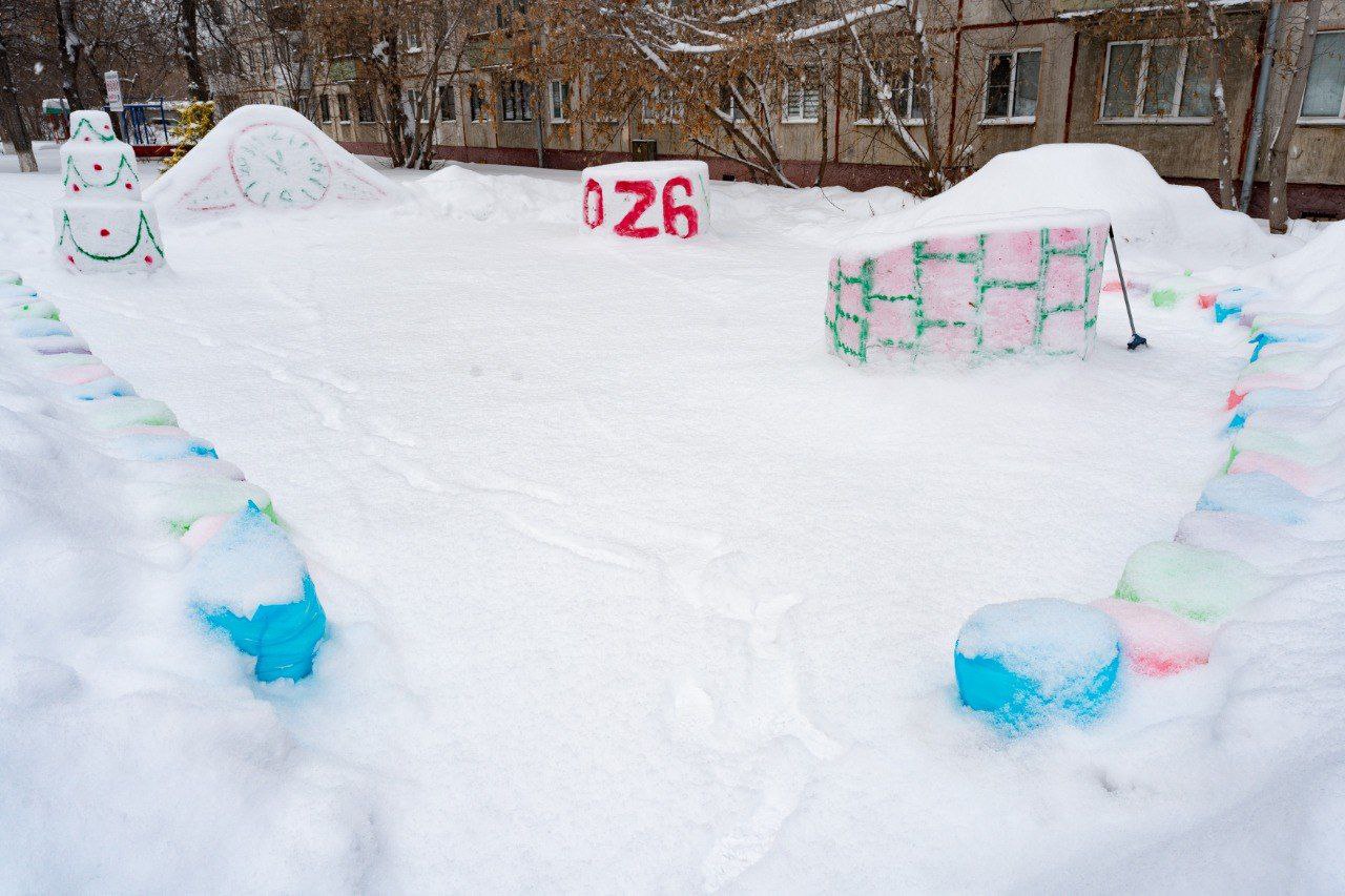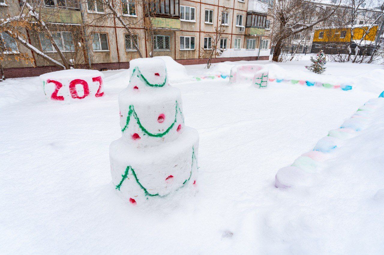 Сейчас на площадке красуются часы из снега, праздничный торт и крепость, а завершает композицию наряженная ёлочка.