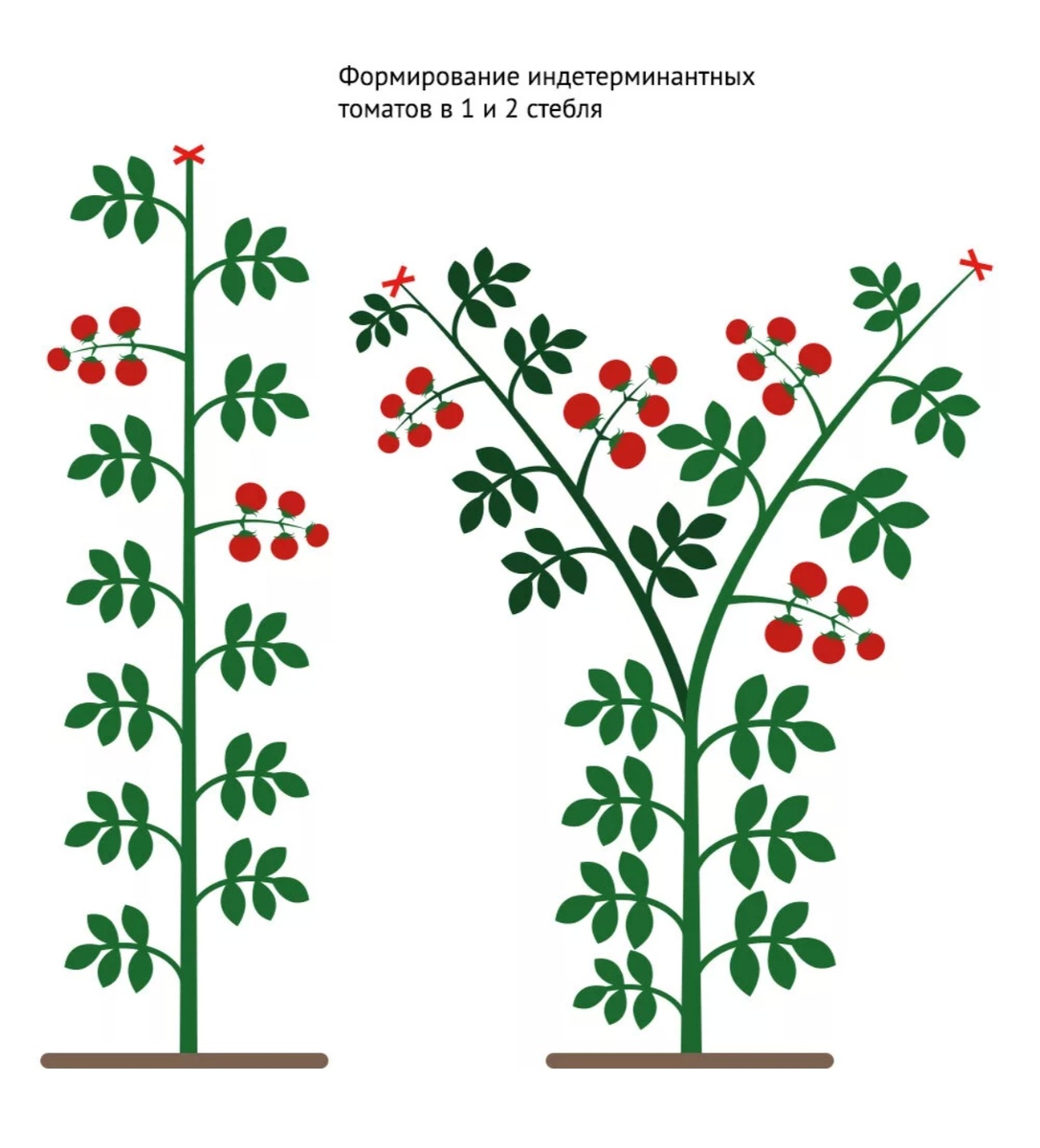 Формирование в два стебля включает оставление главного стебля и одного сильного пасынка под первой цветочной кистью. Удалите остальные боковые побеги, подвяжите оба стебля, и следите за их развитием.