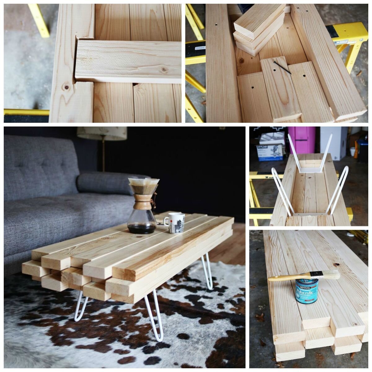Обычные доски из дерева, сочетаясь с элегантными металлическими ножками, могут превратиться в настоящую дизайнерскую находку. Для создания столика не потребуется много материалов — даже небольшие бруски можно использовать в качестве основы, укладывая их в шахматном порядке. Подготовив необходимые детали заранее, за несколько часов можно собрать оригинальный столик для вашего интерьера.
