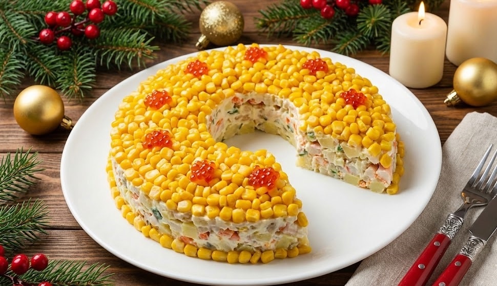 Переходя к оформлению, можно использовать плоское блюдо, заранее намечая контуры подковы. Салатную массу укладывают в форме буквы «U», слегка прижимая, чтобы поверхность была ровной. Затем плотно распределите консервированную кукурузу, придавая «золотой» вид. Завершить можно яркой икрой, украсив поверх кукурузного слоя.