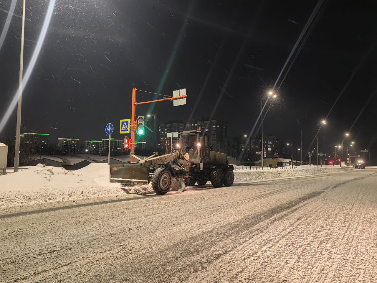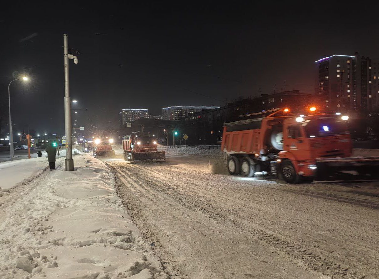 Техника работала на просп. Советский от ул. Весенняя до ул. Мичурина, ул. Мичурина от пр. Советский до пр. Ленина, ул.Кирова от ул.Красноармейская до ул.Н.Островского, пл.Советов, ул. Елыкаевская, ул. Джамбула, ул.Григорьева, ул. Тельмана, ул.Советская, ул. Молодежная, ул. Изумрудная, ул. Щегловская, просп. Весенний, ул. Окружная, ул. Акад. Чихачева. Днём работы продолжатся.