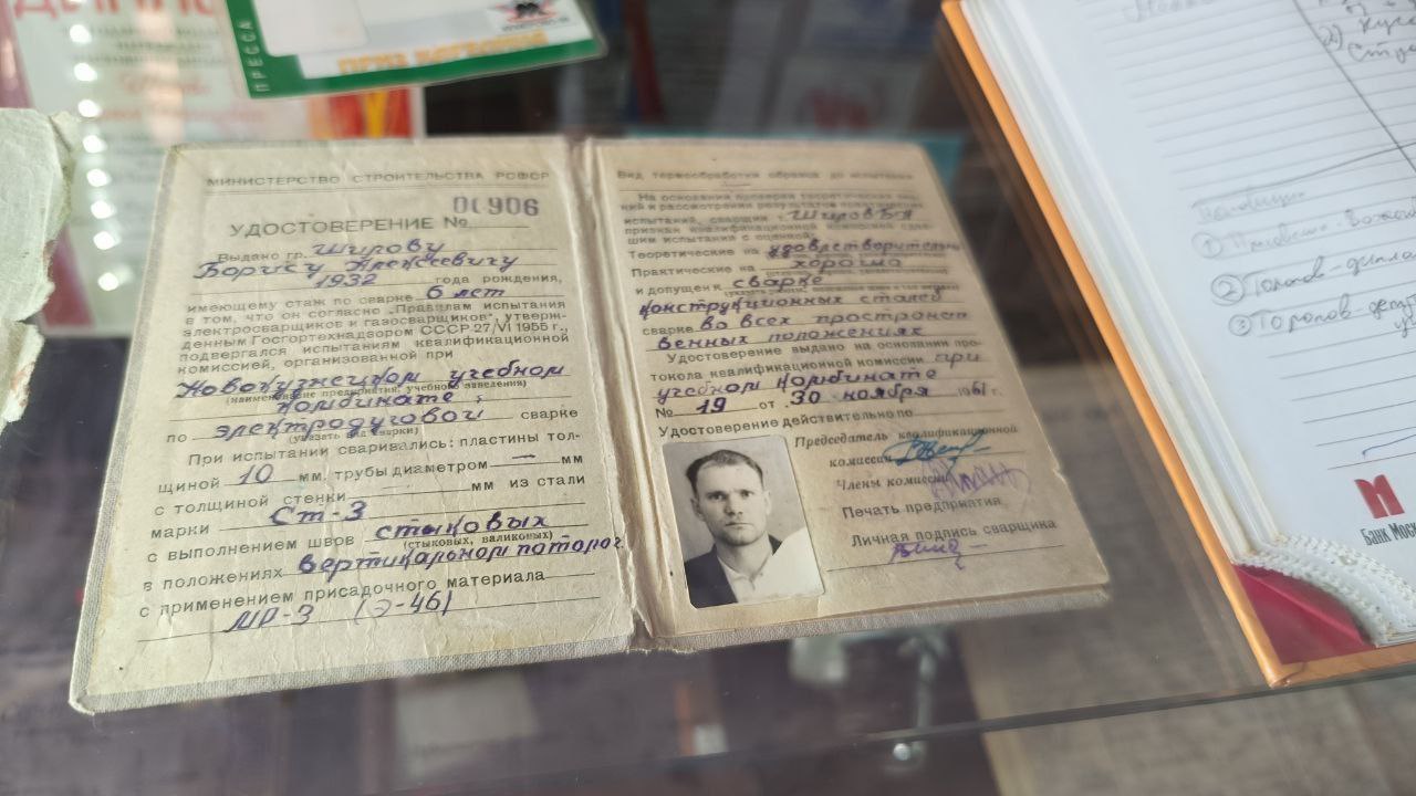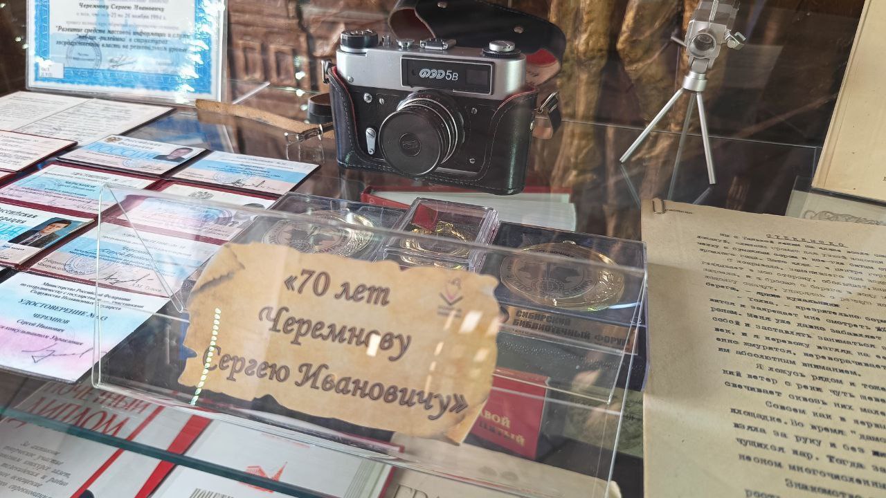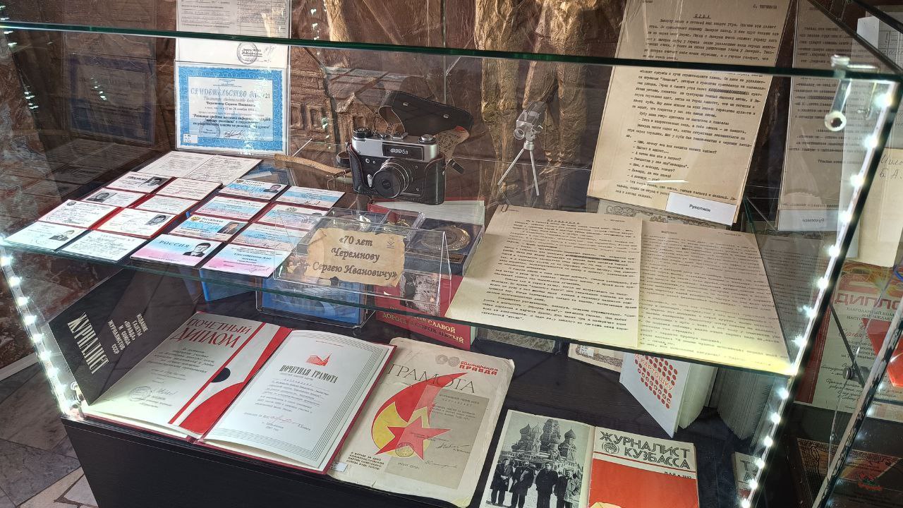 Сергей Борисович Шилов, телеоператор ГТРК «Кузбасс», и Эдуард Владимирович Угрюмов, член "Союза Кузбасских писателей", представили награды - медали и знаки, грамоты, интересные рабочие документы фотографии.