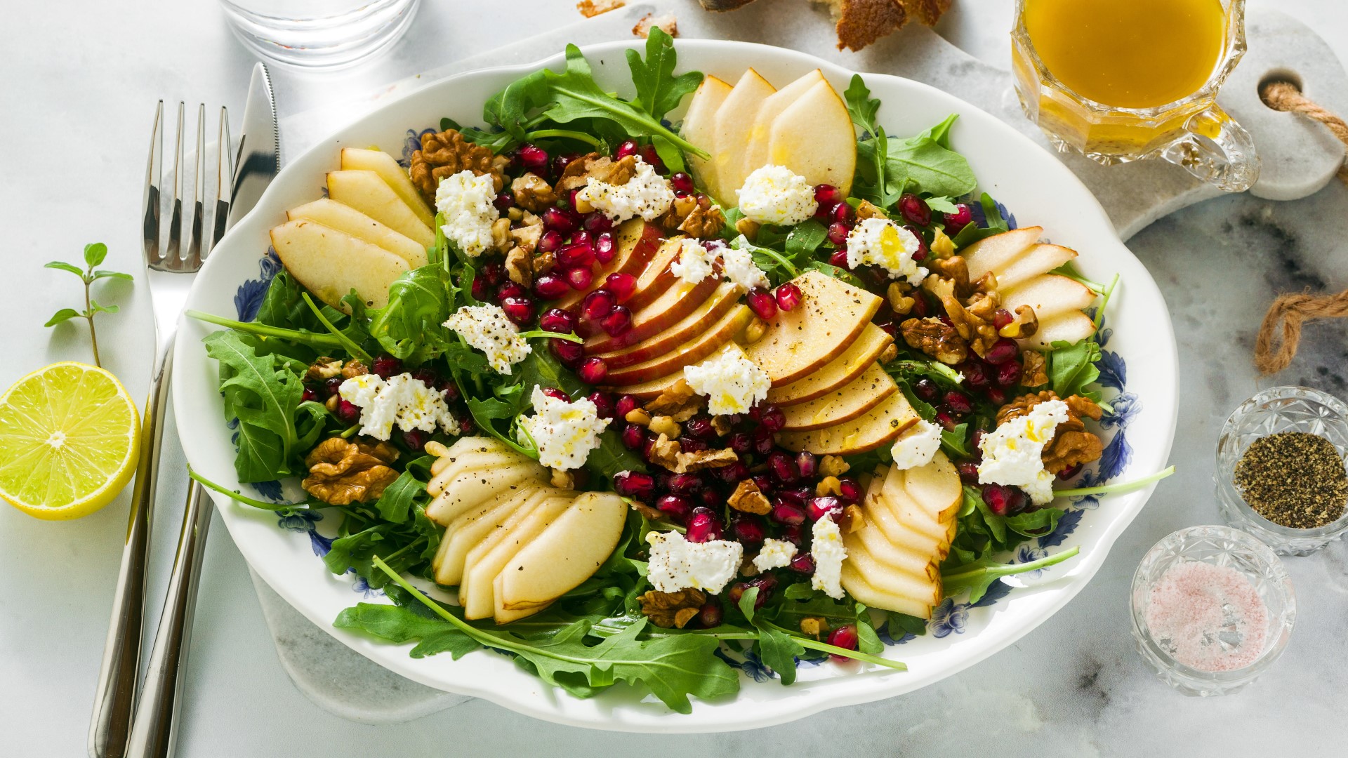 Выложите в миску сначала половину шпината, затем — половину орехов. После — мелко нарезанную грушу вместе с частью зерен граната. Покрошите сверху немного творога и налейте соус. Повторите эти слои еще раз, и салат будет готов.