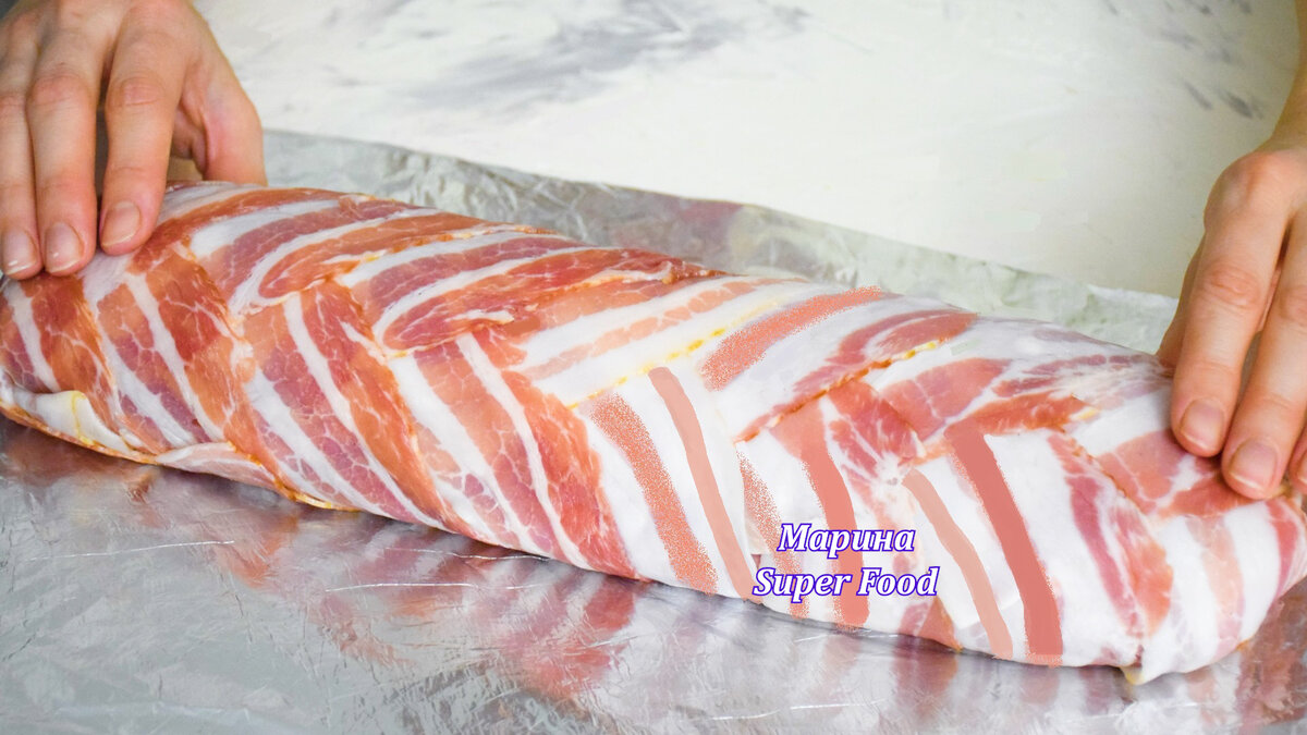 - Рулет сворачивается в плотный, но аккуратный жгут, который затем завертывается в полоски бекона, создавая неповторимый вид.