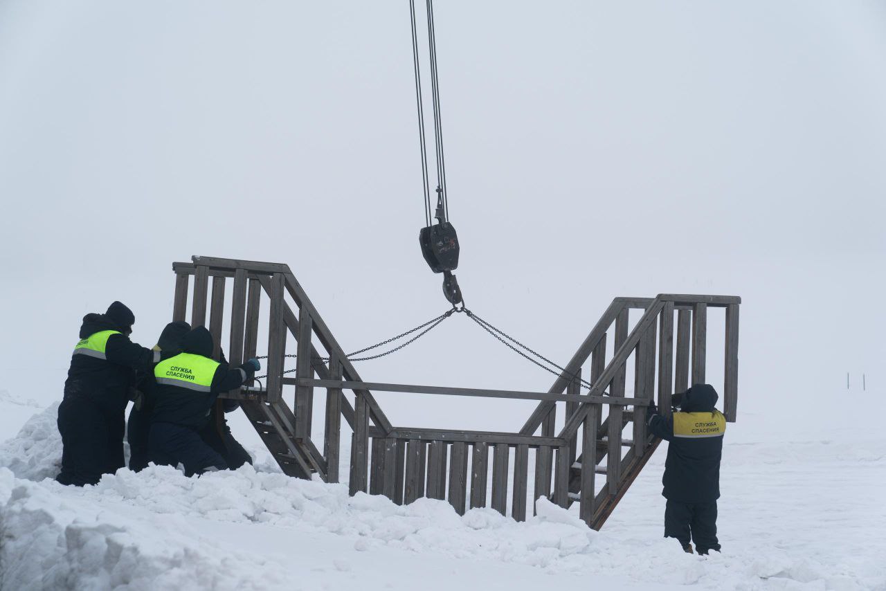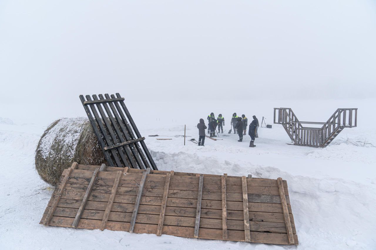 Уже смонтировали ограждения с перилами, оборудовали купель удобным спуском, устанавливают палатки для обогрева.