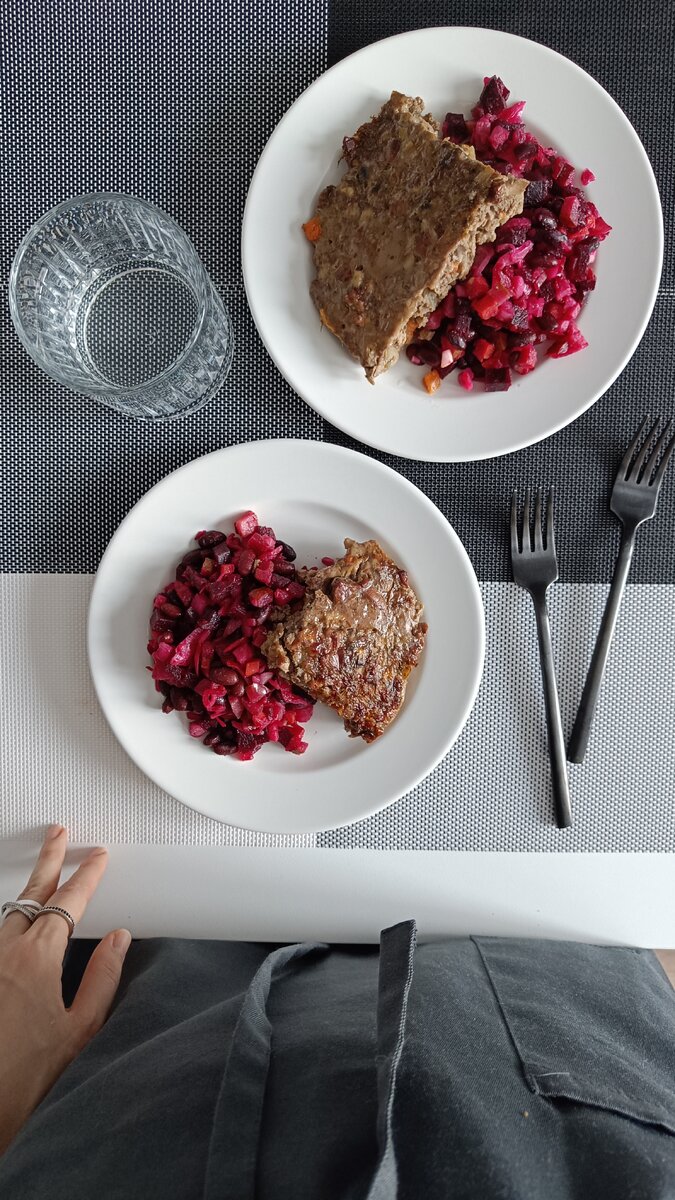 Обед: Винегрет с фасолью вместо традиционного горошка, поданный с мясным хлебом, а на десерт – морковный кекс, приготовленный по рецепту из книги «Осознанная кулинария».