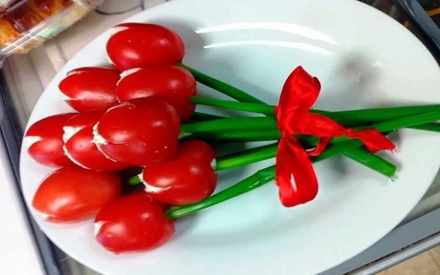 - Закуска из томатов с творогом: это блюдо в виде букета тюльпанов станет отличным дополнением менюшки и подарит эстетическое удовольствие.