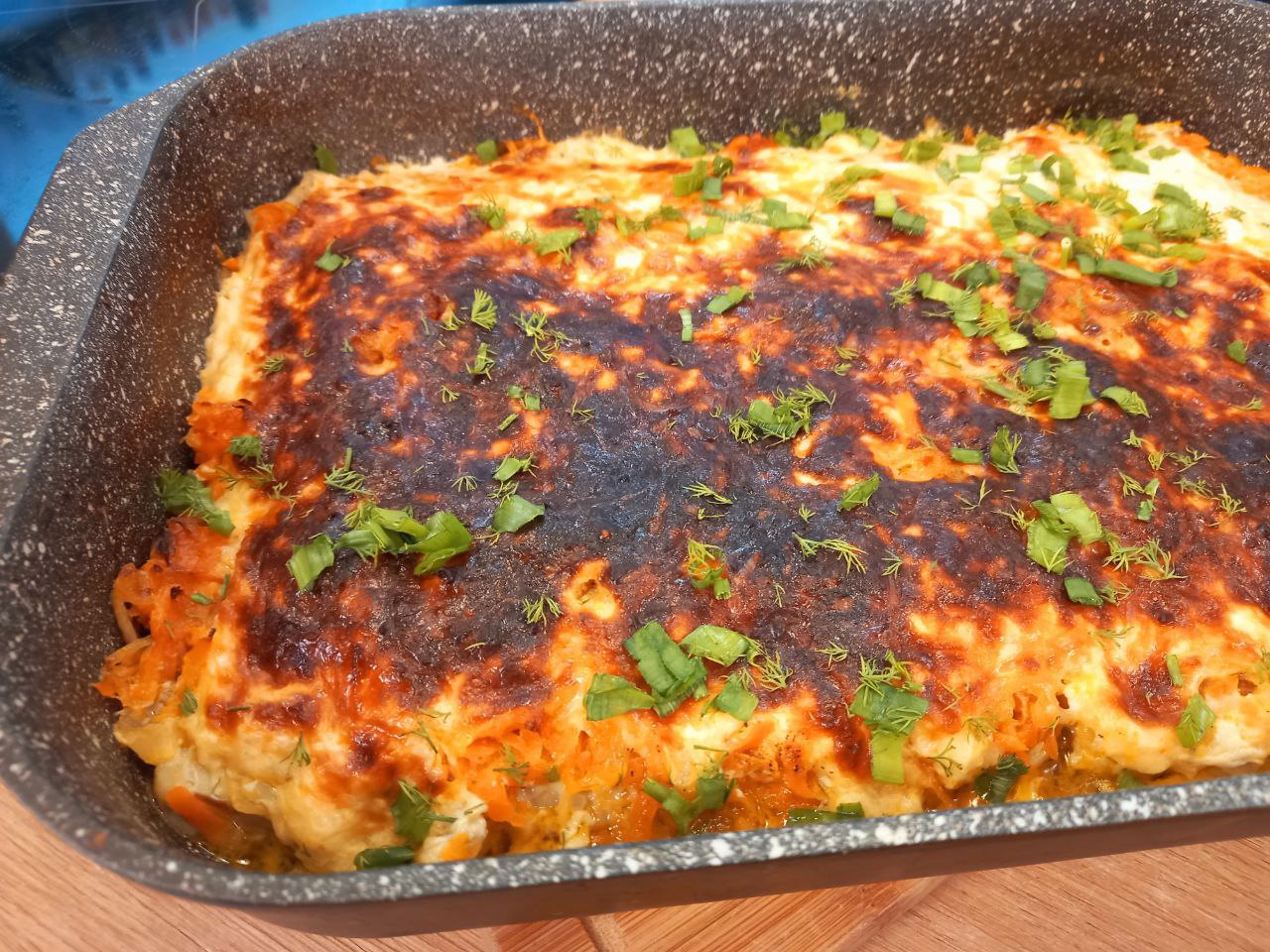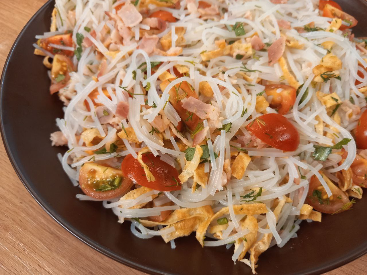 2. На кухне тоже проявим смелость. Нарядим рыбку аппетитной шапочкой и дополним тёплый салат с фунчозой необычными ингредиентами.