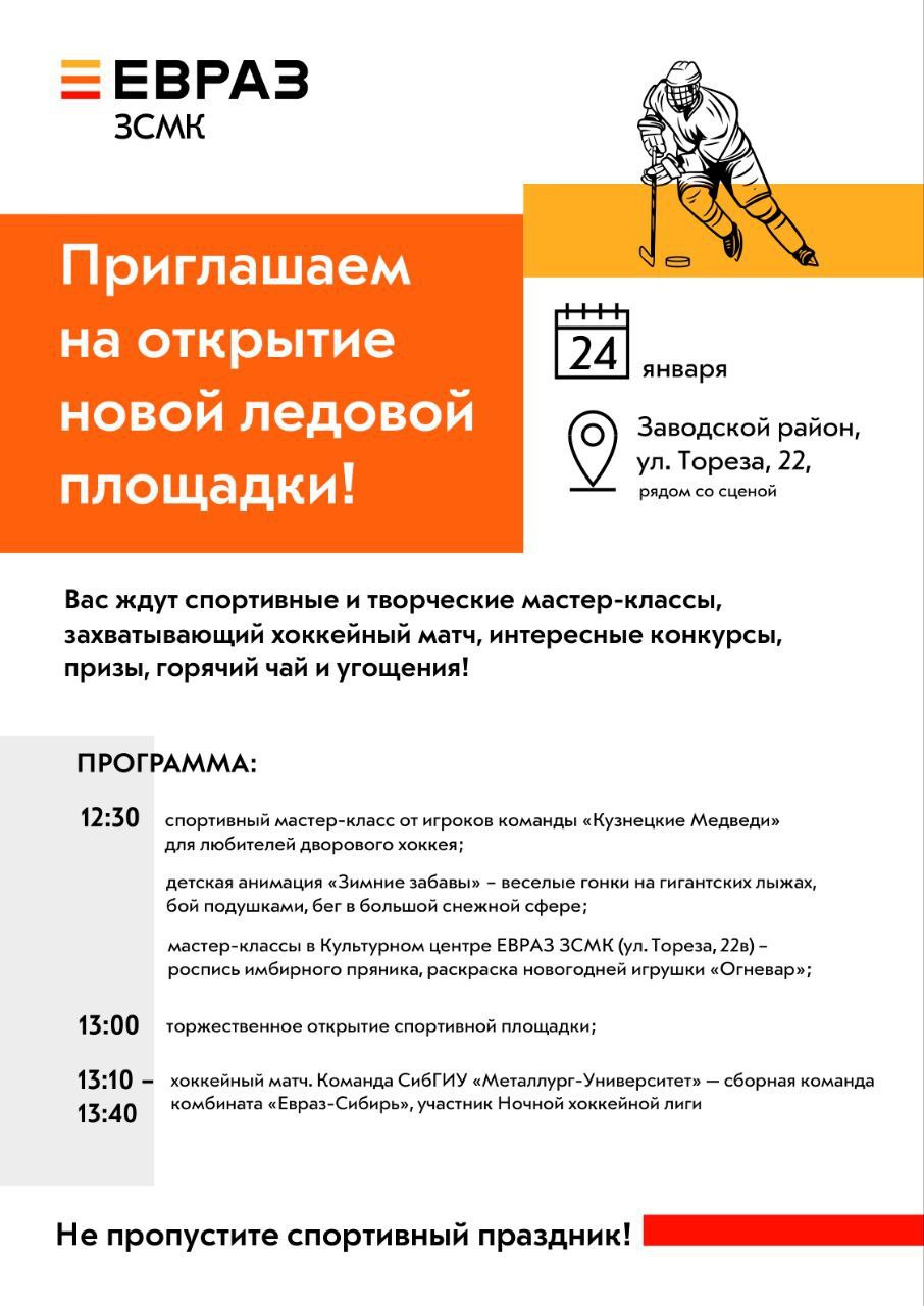Вас ждут спортивные и творческие мастер-классы, захватывающий хоккейный матч между участником ночной хоккейной лиги, сборной командой комбината «ЕВРАЗ Сибирь»и студентами СибГИУ(команда «Металлург-Университет». интересные конкурсы, призы, горячий чай и угощения!