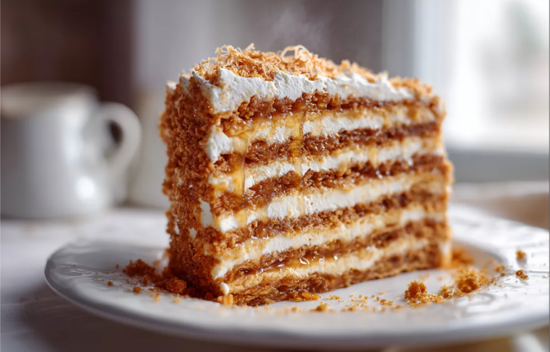 Когда будете подрезать коржи, лучше делать это теплыми — так срез получится ровнее. Крем не взбивайте долго, остановитесь сразу после загустения, а крошку подсушите до легкого орехового аромата — это придаст яркость вкусу.