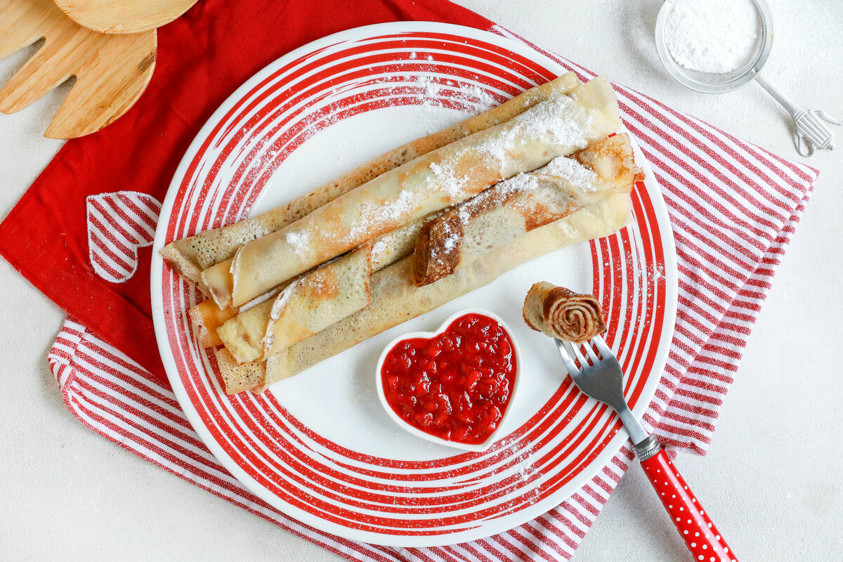 На каждый блинчик выложить ложку маскарпоне, аккуратно разровнять и свернуть в трубочку. Подавайте с клубничным конфитюром сразу же.