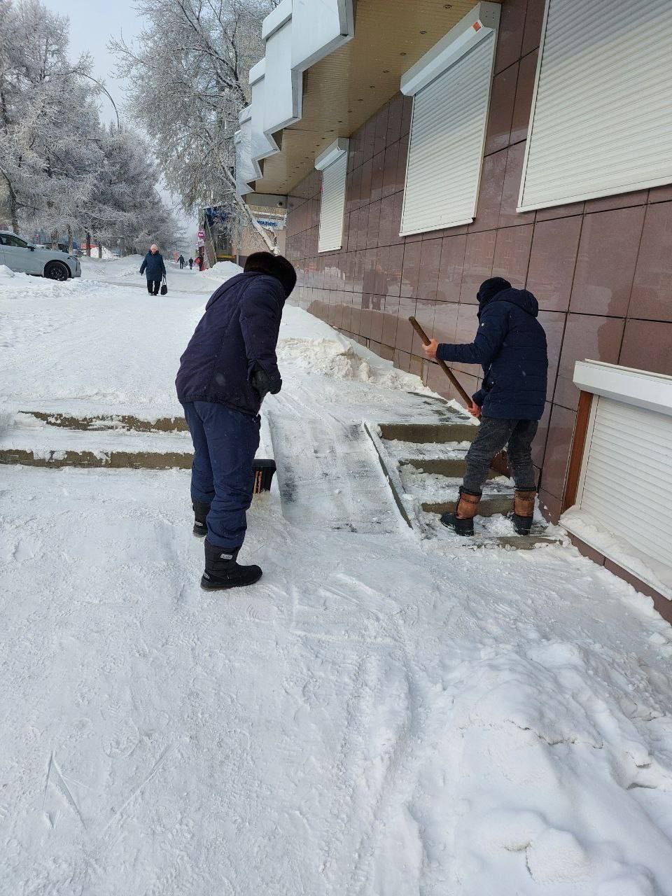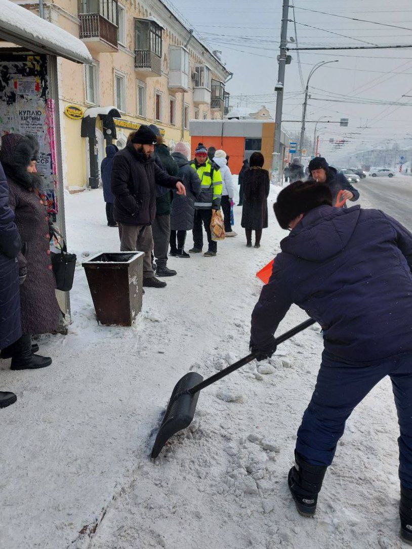 В Центральном районе Кемерова очищают от снега и наледи остановки общественного транспорта