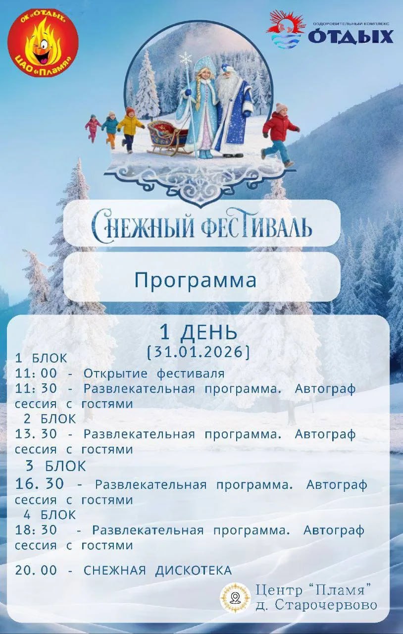 «Снежный фестиваль» будет проходить 31 января и 1 февраля в Центре активного отдыха «Пламя» (д. Старочервово). Посетить его могут все желающие, дети и взрослые. Можно арендовать номера, можно самостоятельно приехать на событие в любой из двух дней. Также МАУ «Отдых» организует поездки для групп.