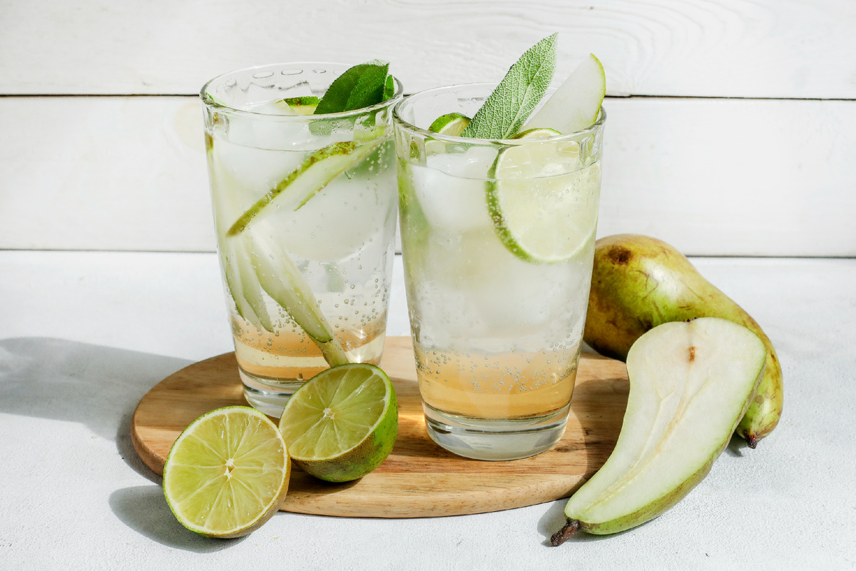 Шаг 1: Разомните листья шалфея руками. Нарежьте груши тонкими ломтиками. В recipiente выжмите сок лайма, добавьте размятый шалфей, грушевый сироп и минеральную воду. Оставьте несколько ломтиков груши для украшения.