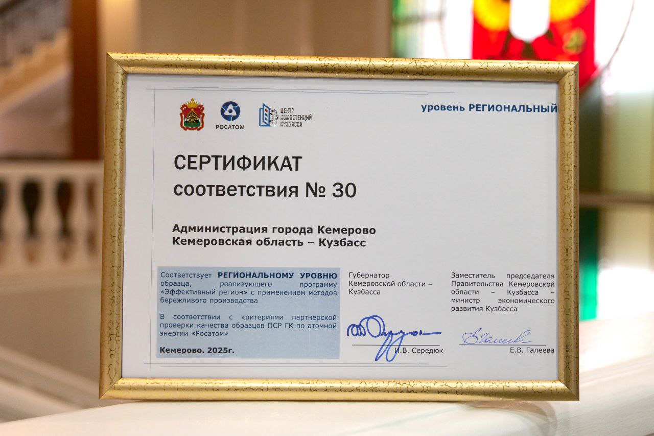 По результатам проверки администрации Кемерова присвоили статус соответствия региональному уровню образца, реализующего программу «Эффективный регион» с применением методов бережливого производства.