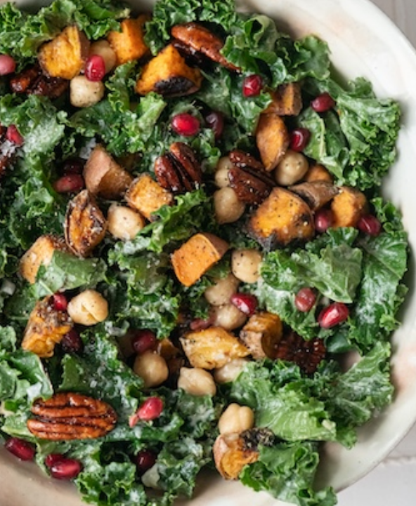 Порядок здесь важен, но не строг: батат запекается до мягкости, затем соединяется с кейлом и нутом. Дрессинг добавляет кремовую нотку без перегруженности, а посыпка из пеканов и граната завершает композицию цветом и лёгкой хрусткостью.